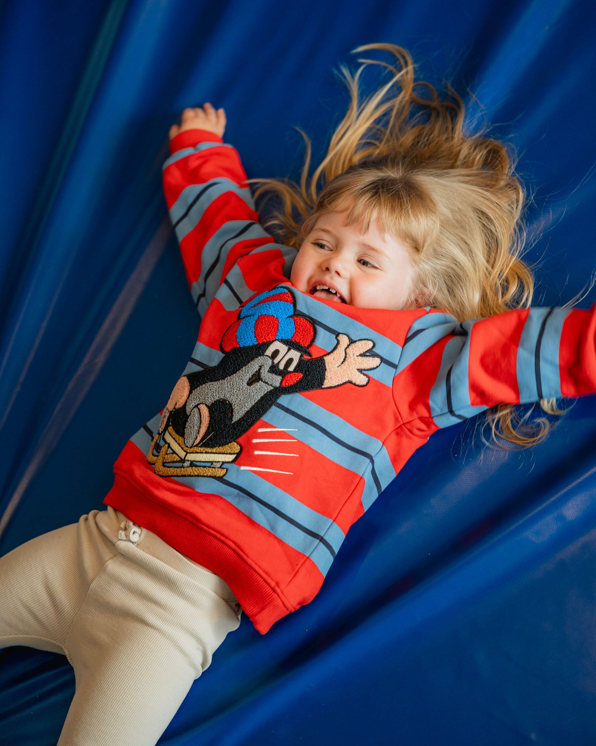 Dieser farbenfrohe Sweater ist perfekt für den Winter und die nächste Schlittenfahrt! Im Zentrum des Designs steht der kleine Maulwurf in voller Fahrt auf seinem Schlitten. Die Figur ist als kuschelige Frottee-Stickerei umgesetzt, was für eine besonders weiche Haptik sorgt. Das Design wird durch auffällige Streifen in Rot und Blau ergänzt, die auch auf Ärmeln und der Rückseite gedruckt sind.