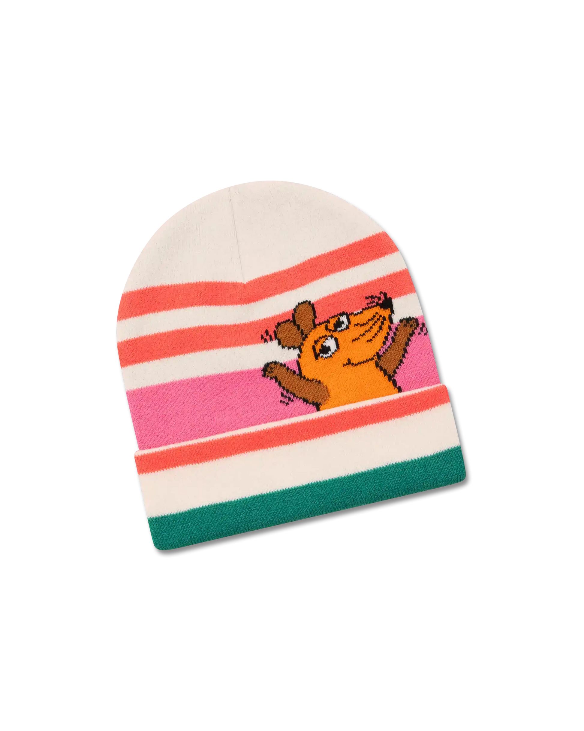 Ce bonnet douillet est le compagnon idéal des journées fraîches et apporte une touche de couleur. La célèbre souris nous sourit d'un air malicieux. Confectionné dans un tissu résistant de haute qualité, il offre une texture agréable, des couleurs éclatantes et une grande durabilité. Son magnifique motif à rayures multicolores, dans des tons crème doux, rouge vif et vert olive profond, illumine instantanément le visage.