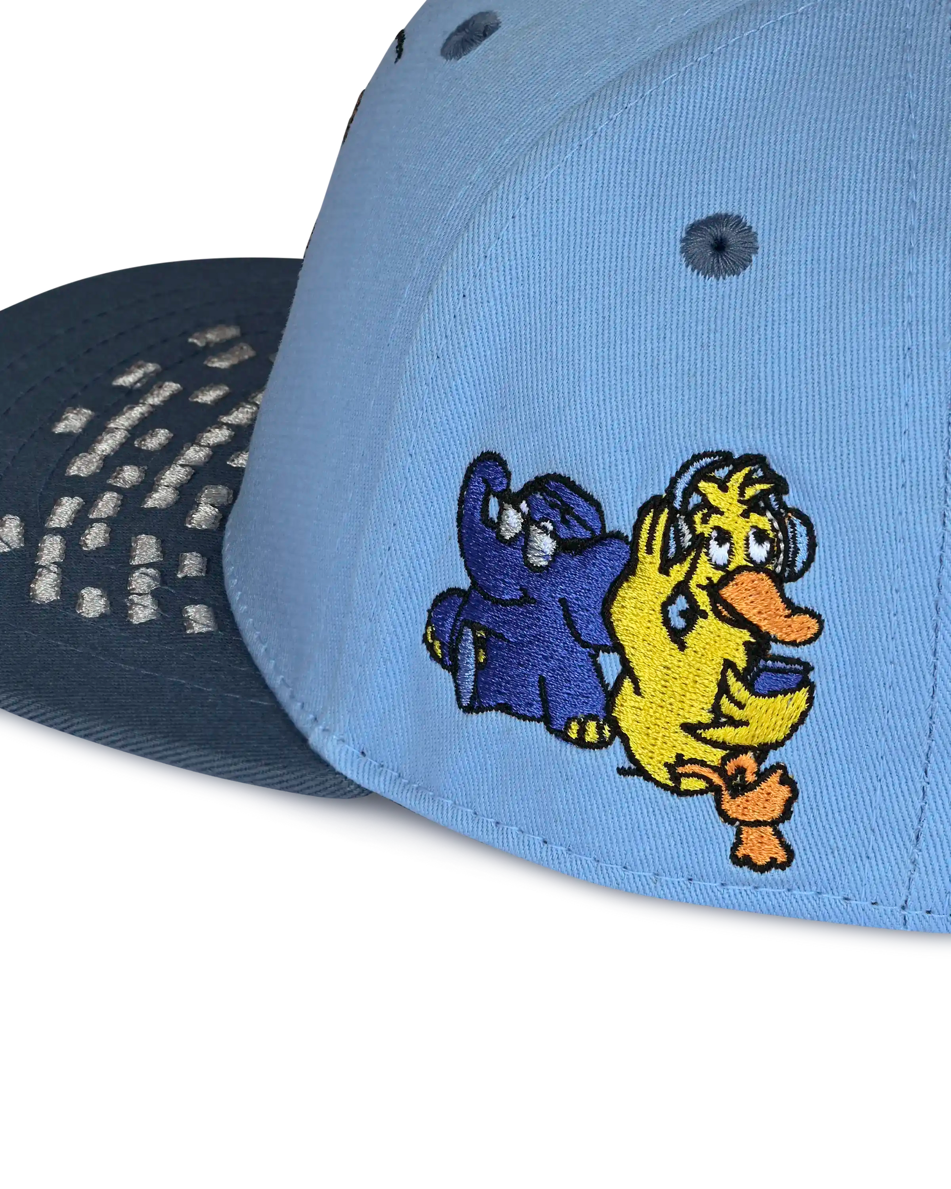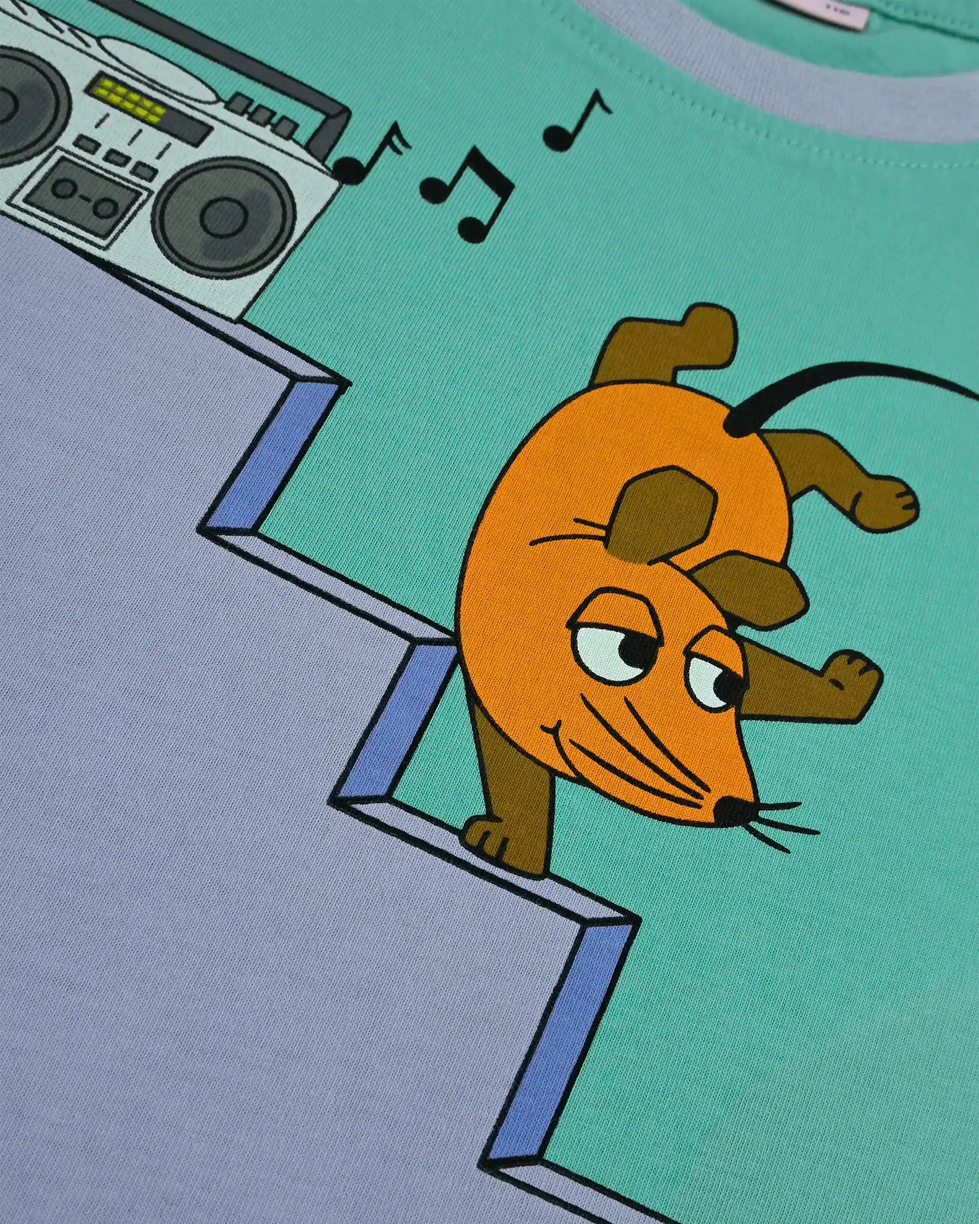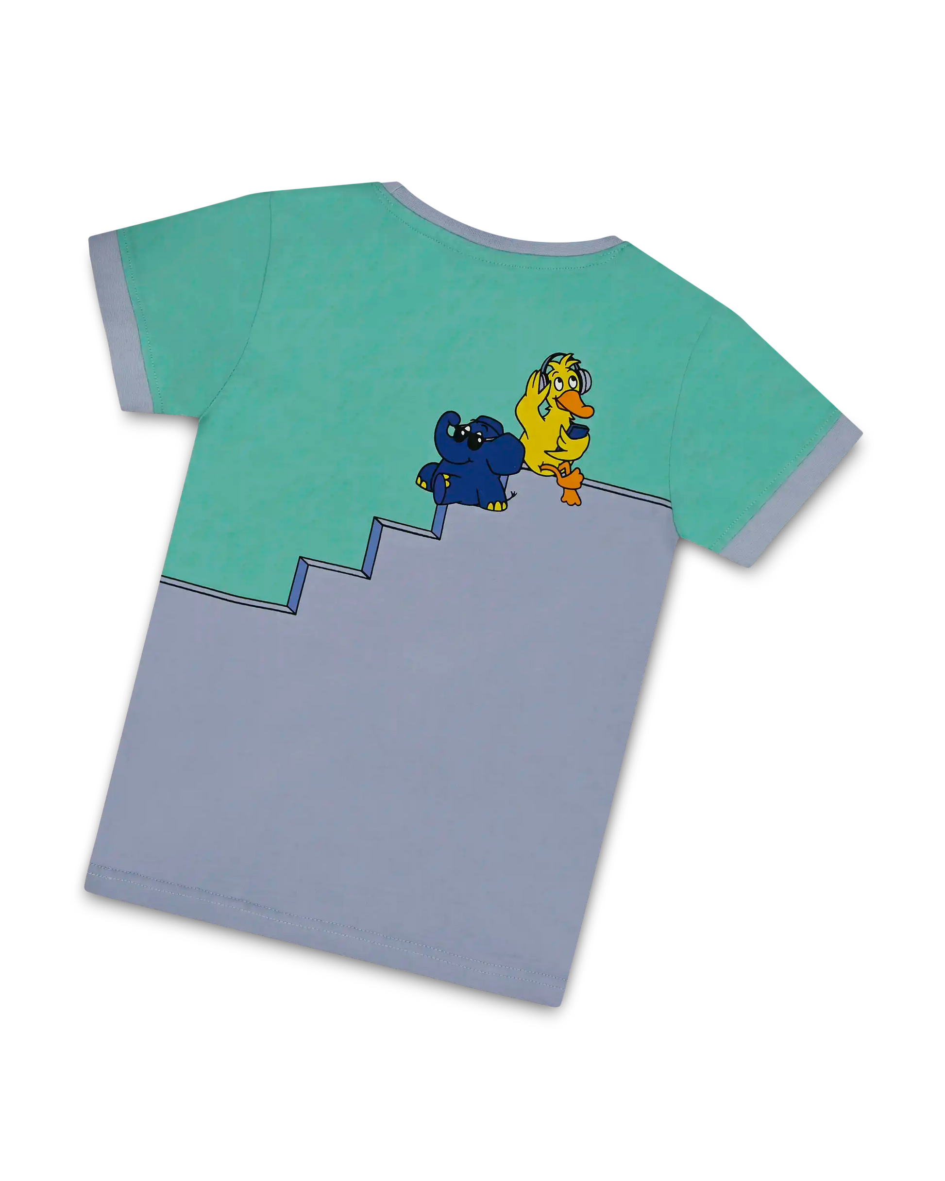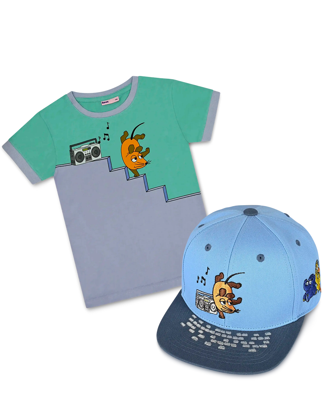 Die Snapback Boombox bringt Farbe und Rhythmus in den Alltag – mit Maus, Elefant und Ente, die gemeinsam lässig vor ihrer Boombox stehen. Die frische Blau-Grau-Kombination und die energiegeladene Illustration machen sie zum perfekten Begleiter für kleine Musik- und Spaßfans. Passend dazu das Boombox T-Shirt in kräftigem Grün und Lila, das den Look mit den drei Freunden in derselben coolen Szene abrundet. Zusammen entsteht ein Set voller Energie, Freundschaft und guter Laune – ideal für den Schulstart oder den nächsten Spielplatz-Jam.