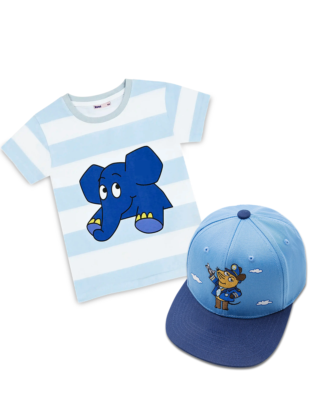 Abheben ins neue Schuljahr – Maus Pilot Snapback und Elefant Guck-Guck T-Shirt im fröhlichen „Back to School“-Set.