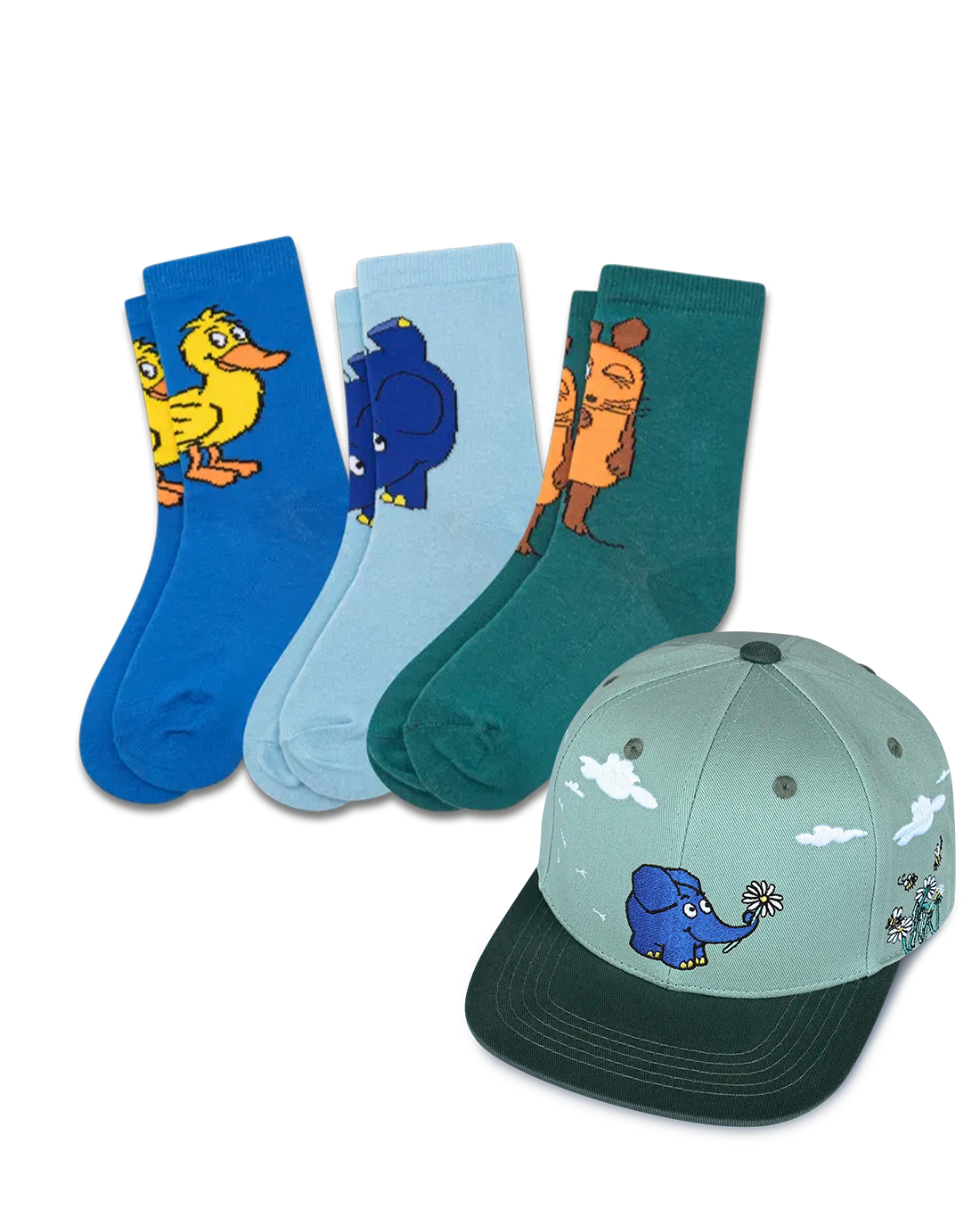 Frühlingsfrisch unterwegs – Elefant Snapback & Große Freunde Socken im bunten Set.
