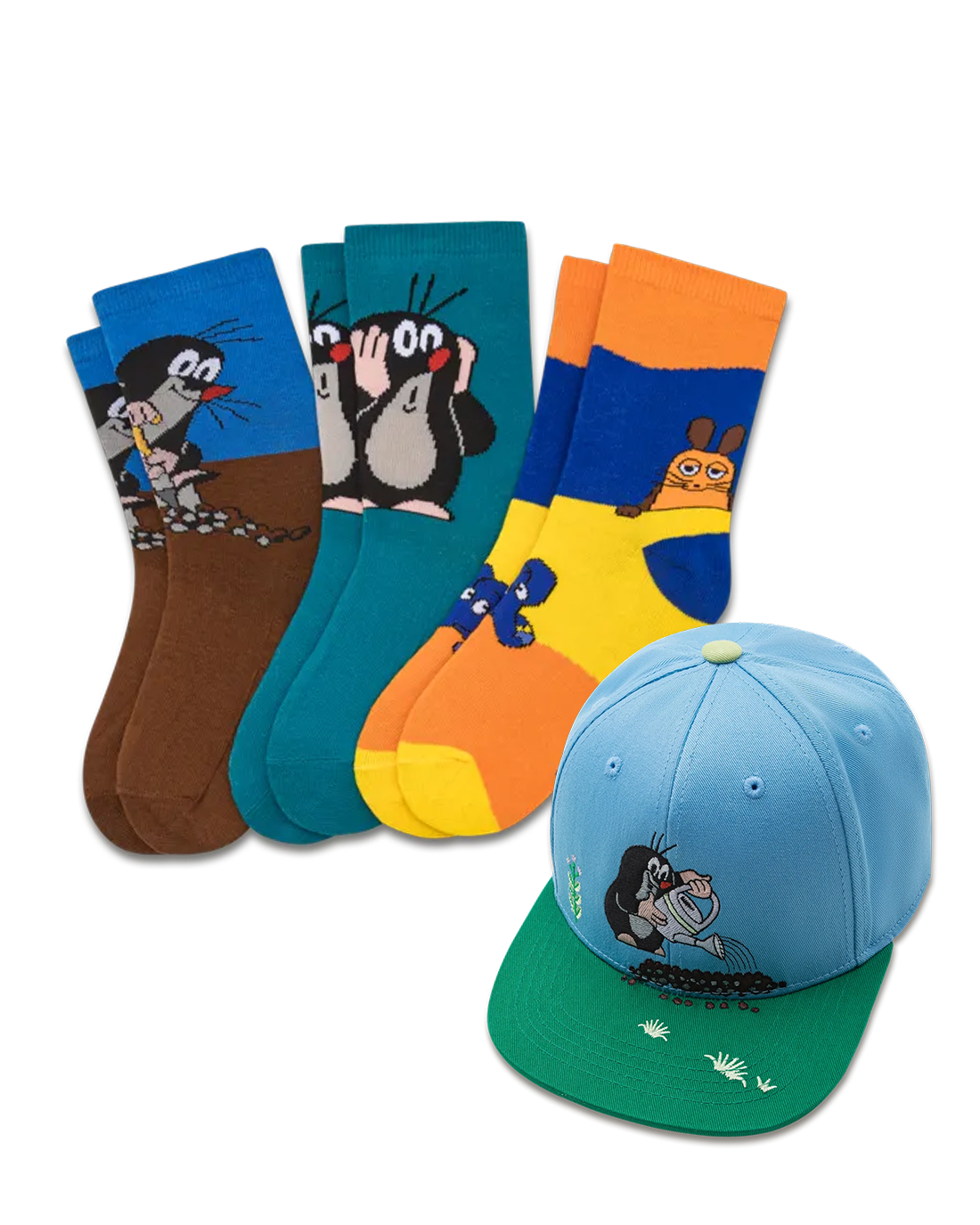 Fröhlich in den Frühling – Maulwurf Snapback & Maus & Maulwurf Socken im bunten Set.