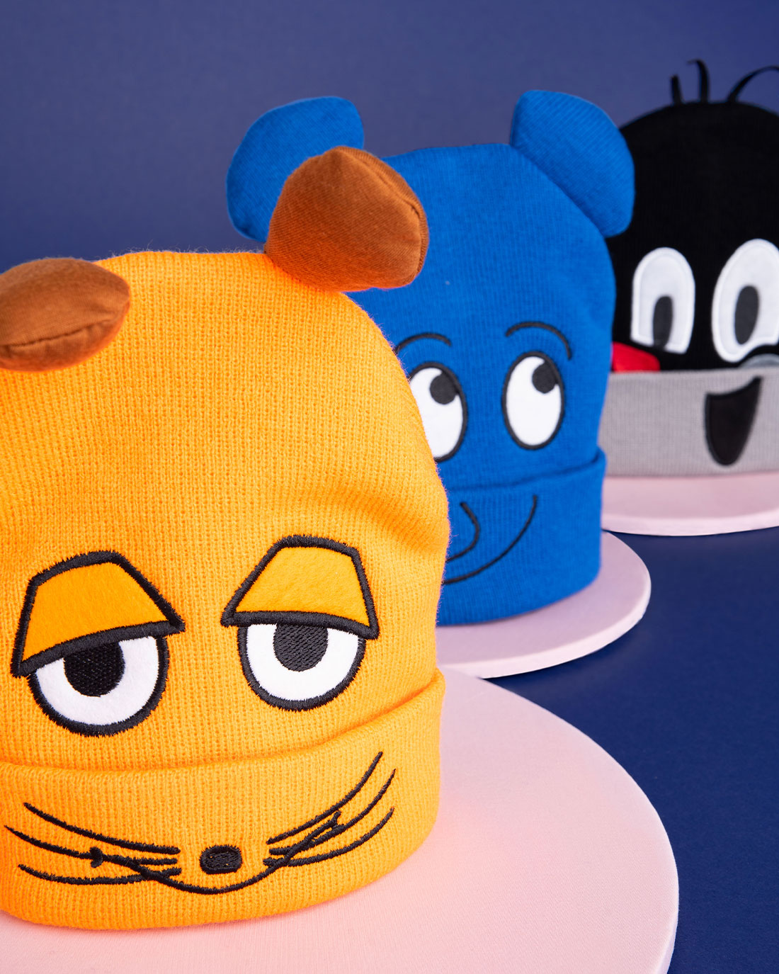 Dreifach kuschelig – Maulwurf, Maus & Elefant Mascot Beanies im fröhlichen Winter-Set.