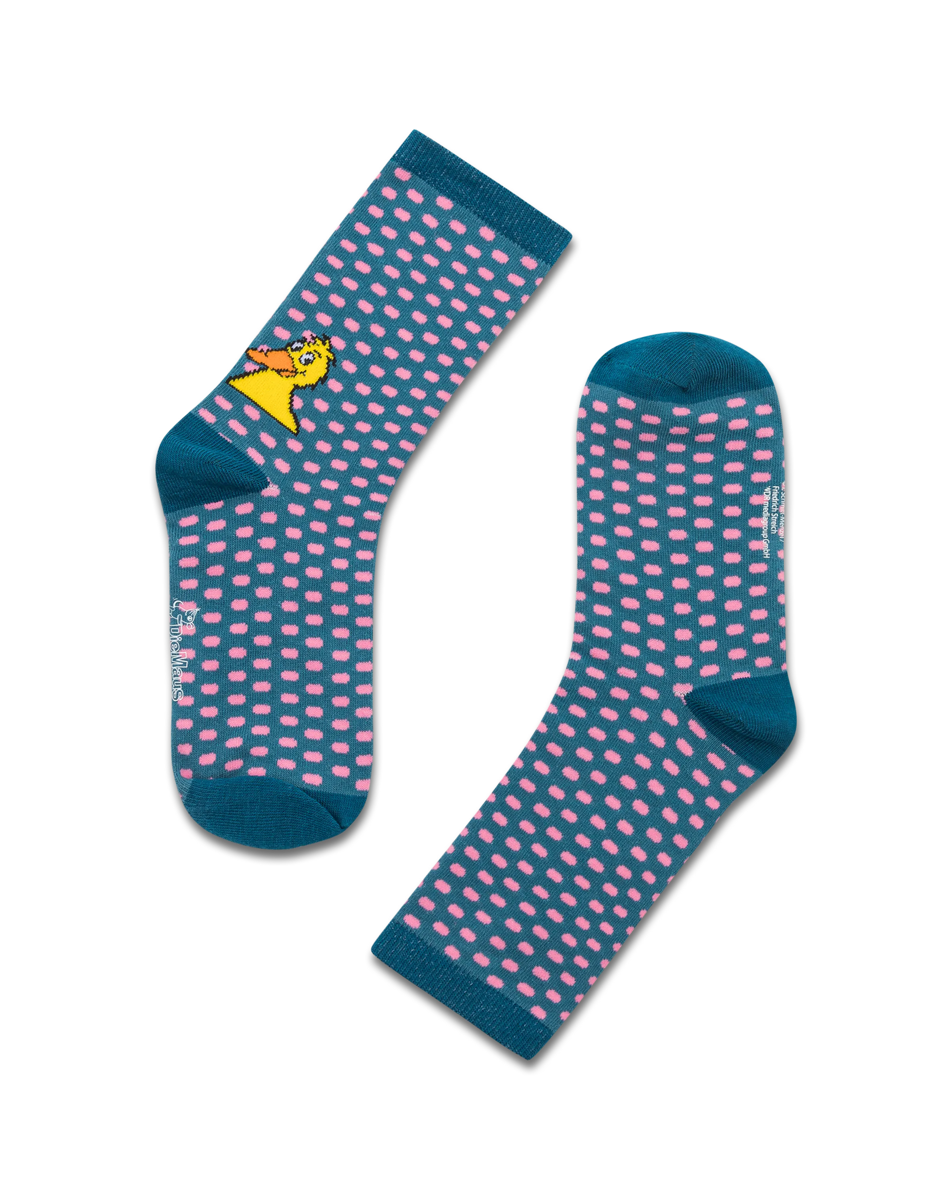 Die Ente "All Over" Socken in türkis/rosa mit eingewebten kleinen ovalen Mustern. Auf der linken Seite ist die Ente eingewebt.