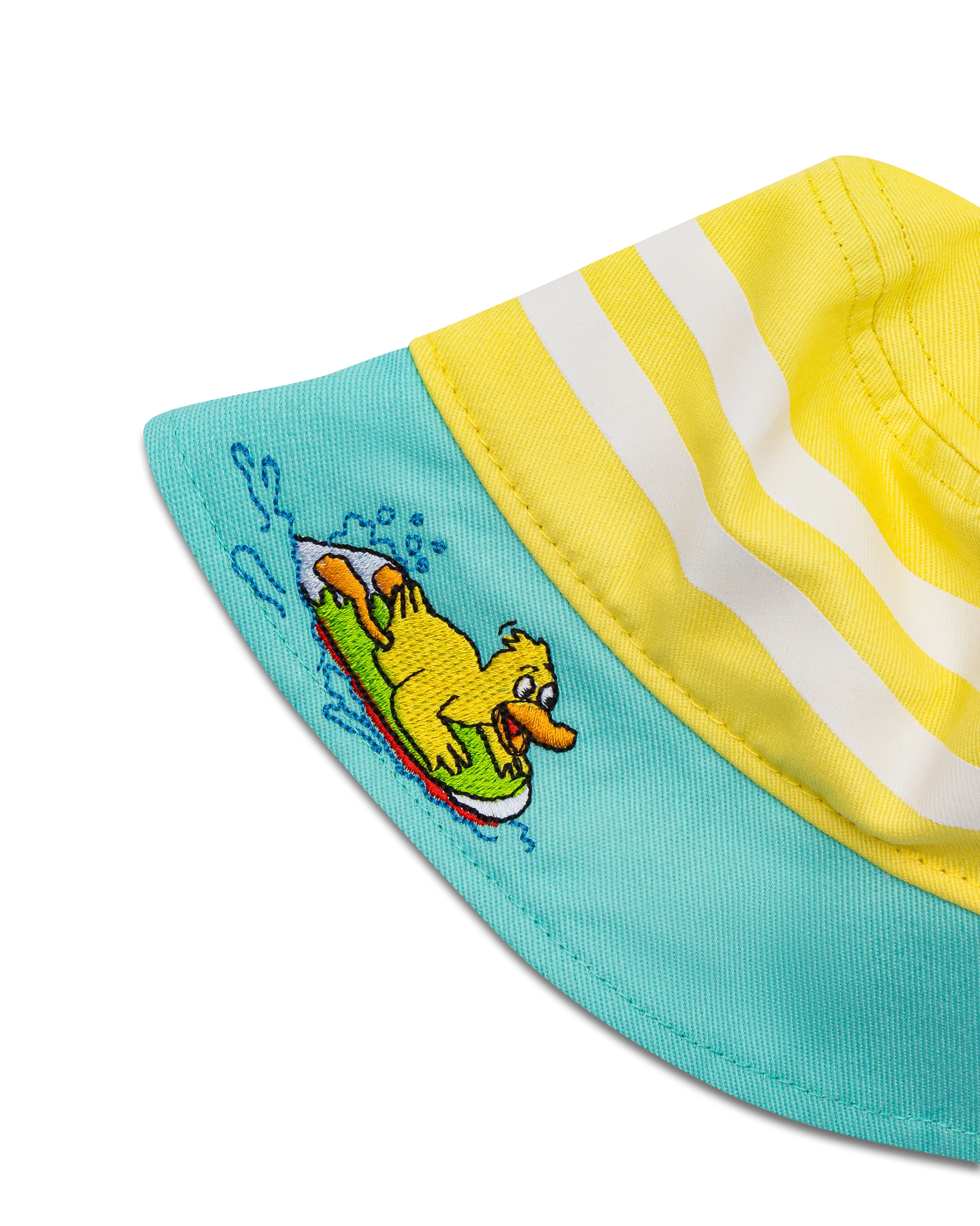 Unser cooler Bucket Hat kombiniert Gelb mit weißen Streifen an der Krone und einer türkisen Krempe. Die Maus von 'Die Sendung mit der Maus' mit Sonnenbrille auf der linken Seite und die surfende Ente auf der rechten Seite verleihen ihm einen verspielten Look.