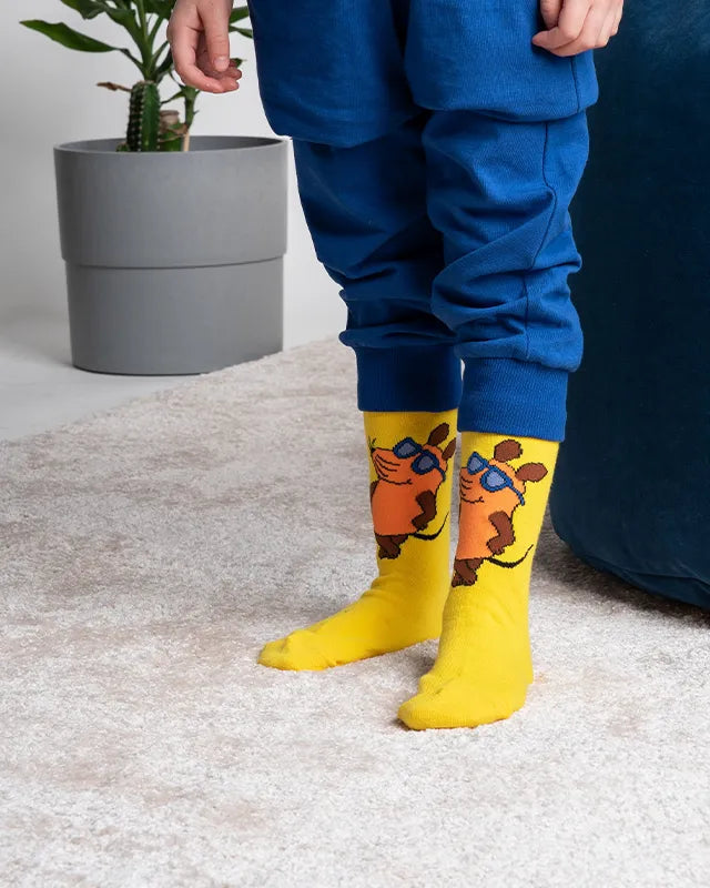 Gelbe Beachboy-Socken mit cooler Maus – auffällig, bequem und perfekt für sonnige Abenteuer kleiner Fans der Kultfigur.
