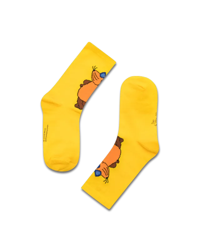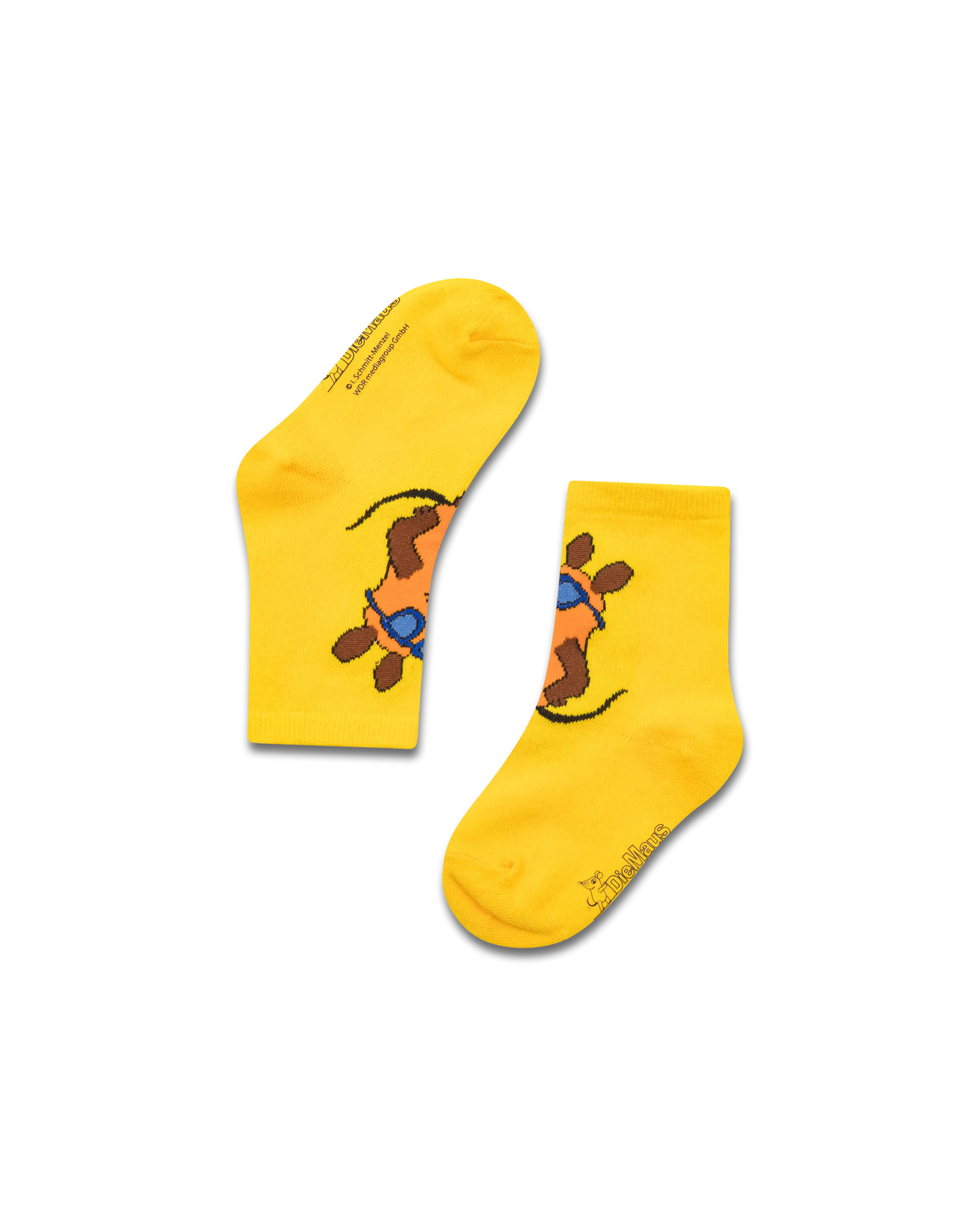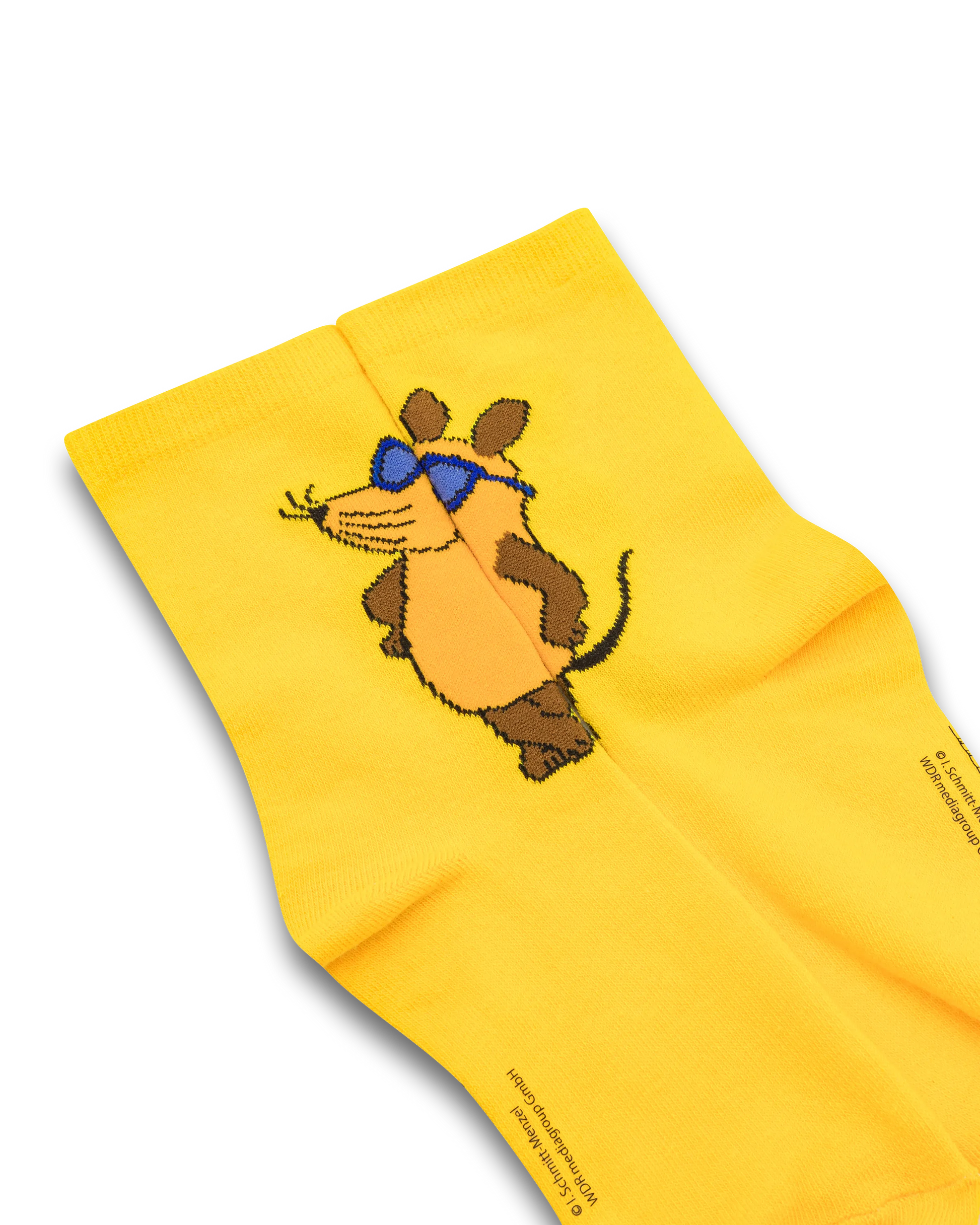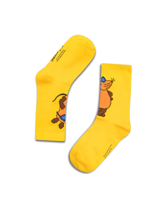 Die Maus "Beachboy" Socken in gelb mit der Maus in cooler Pose vorne groß eingewebt.