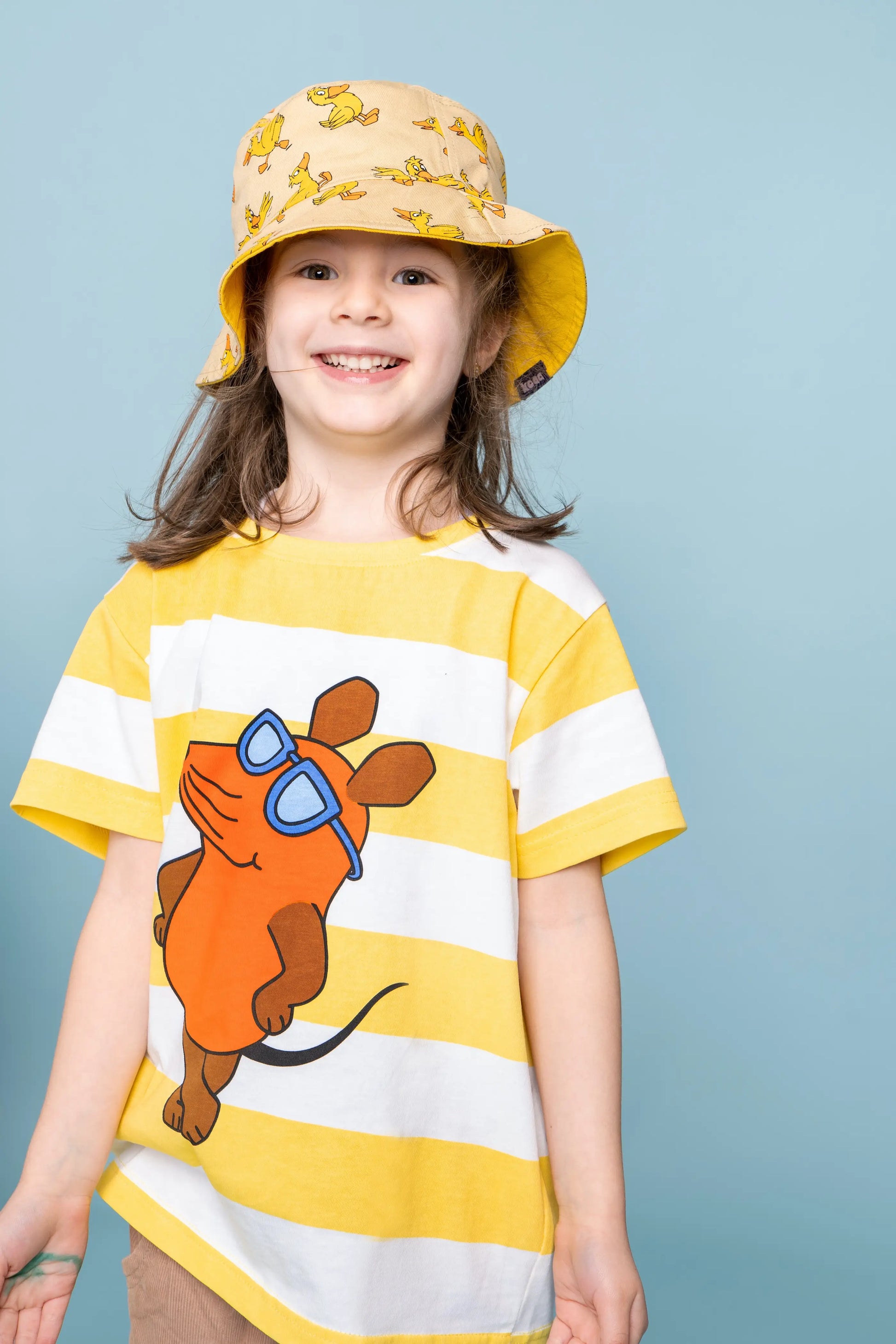"Die Maus Beachboy Stripes – T-Shirt" fröhlich gestreift in Gelb und Weiß. Ein niedlicher Maus-Aufdruck aus 'Die Sendung mit der Maus' mit blauer Sonnenbrille auf der Vorderseite. Lässiger Stil für kleine Abenteurer!