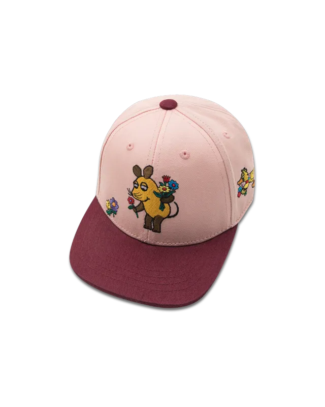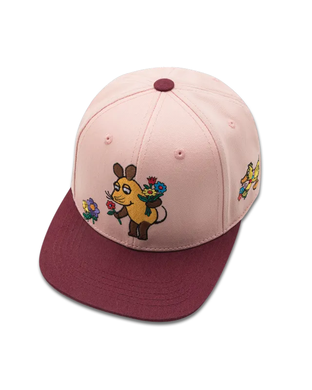 Die Maus "Frühling" Snapback in rosa/lila mit feinem Stick. Die Cap zeigt die Maus und Ente beim Blumen pflücken.