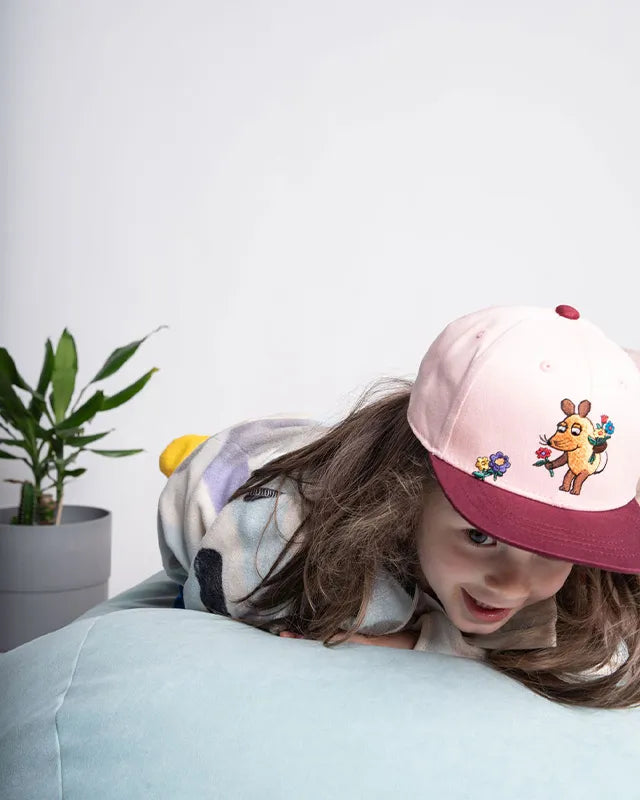 Frühlingshafte Snapback in Rosa/Lila – mit Maus und Ente beim Blumenpflücken, fröhlich bestickt für kleine Natur- und Maus-Fans.