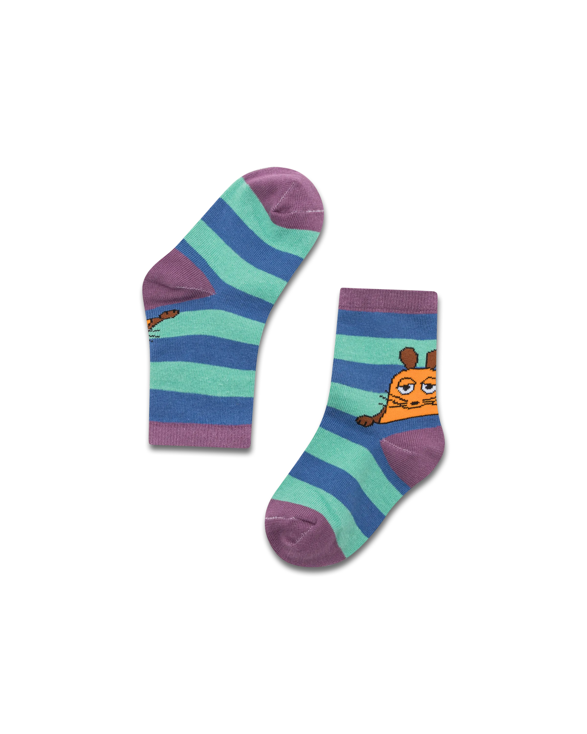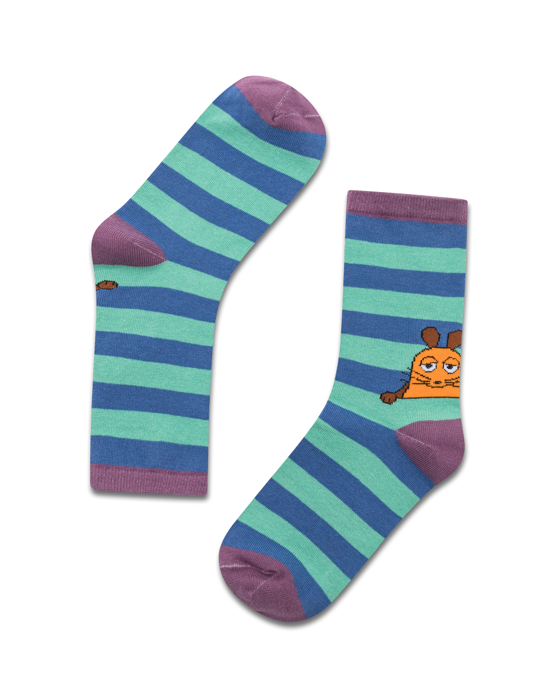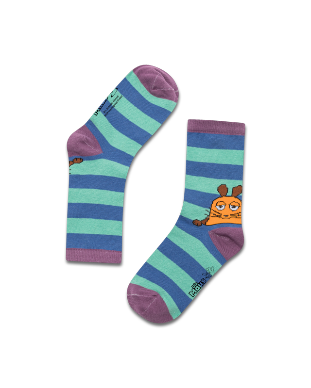 Stripes-Socken mit blau-grünen Streifen und süßer Maus – bequem, farbenfroh und ideal für kleine Fans der Kultfigur.