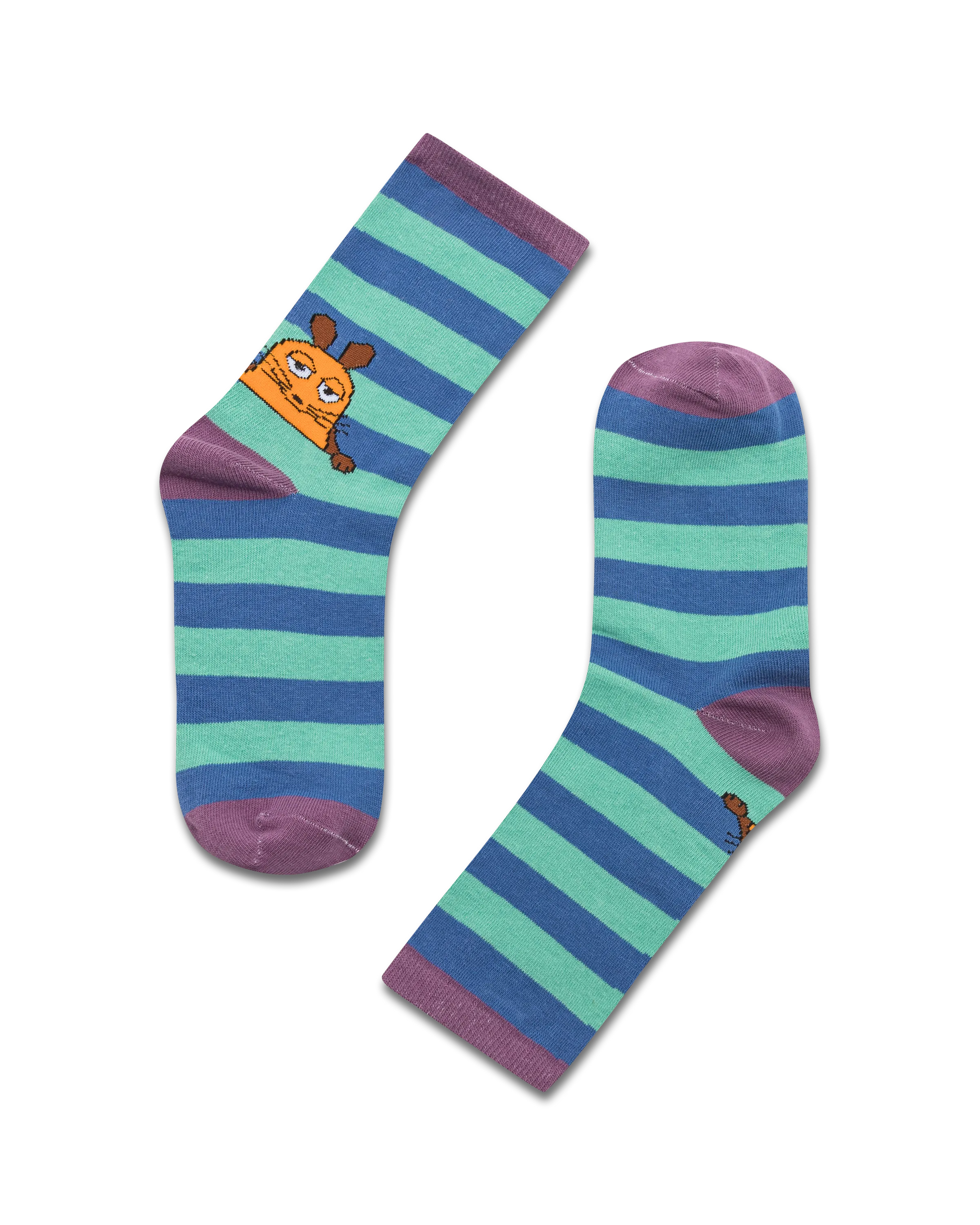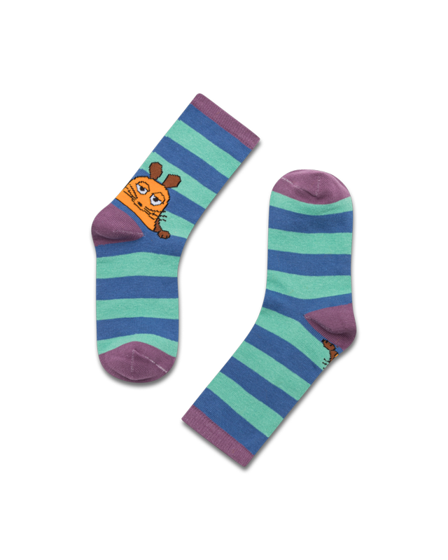 Die Maus "Stripes" Socken mit blau-grünen Streifen. Auf der linken Seite ist die Maus in süßer Pose eingewebt.