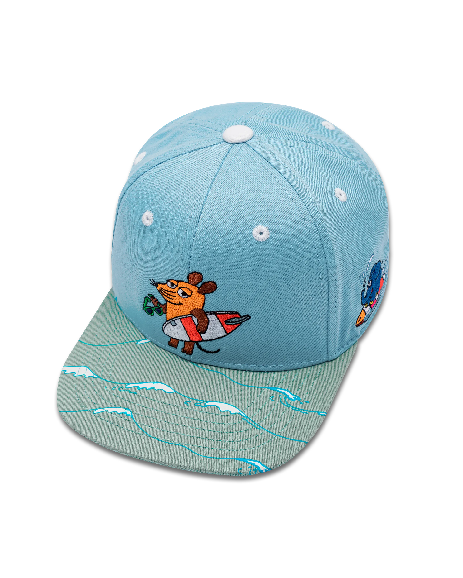 Snapback Cap mit einem türkisfarbenen Schirm und einem hellblauen Paneel. Die Maus mit Surfbrett und Sonnenbrille ist auf der Vorderseite zu sehen, während der Elefant auf der linken Seite surft. Auf dem Schirm laufen weiße und blaue Wasserwellen - perfekt für Strandabenteuer!
