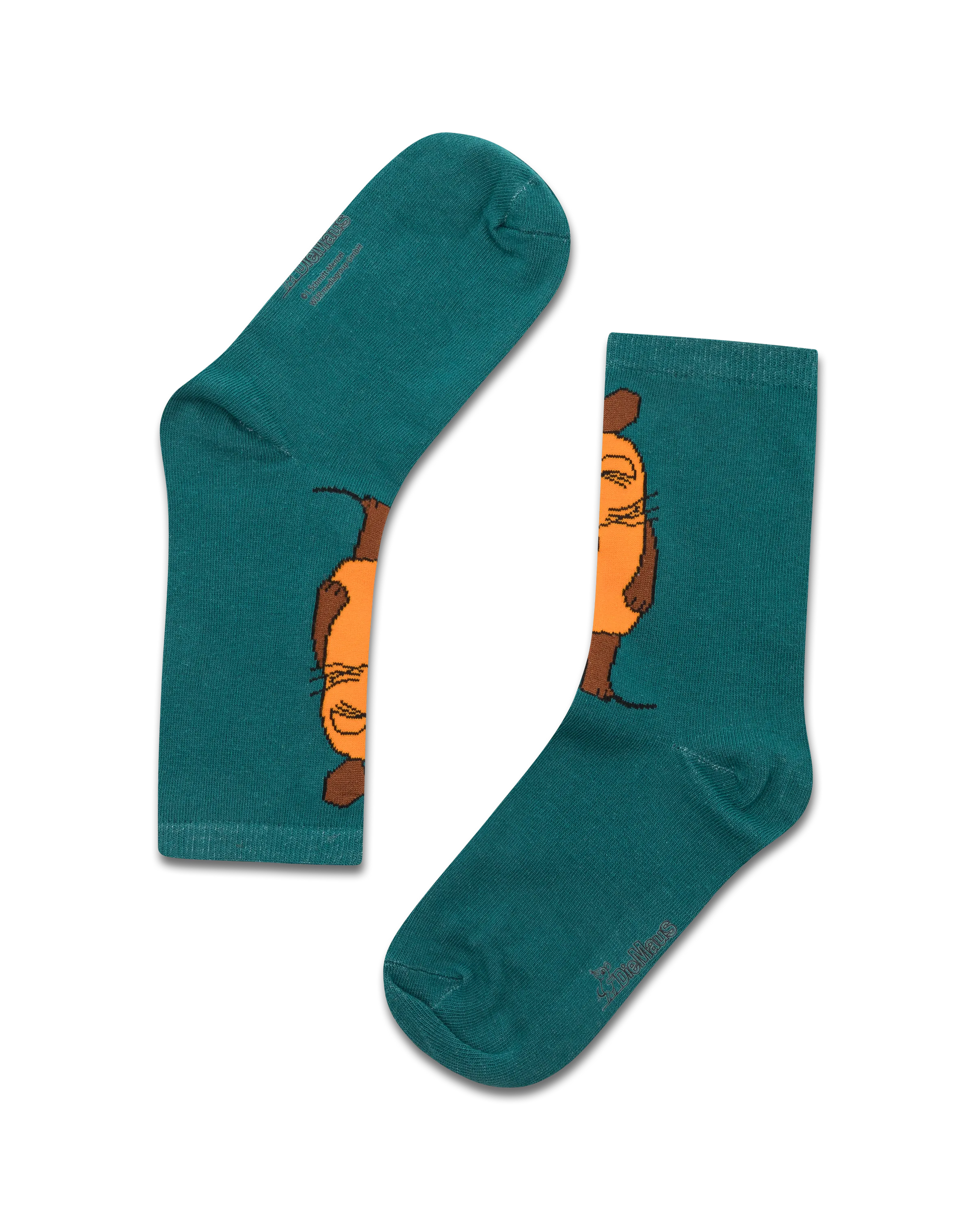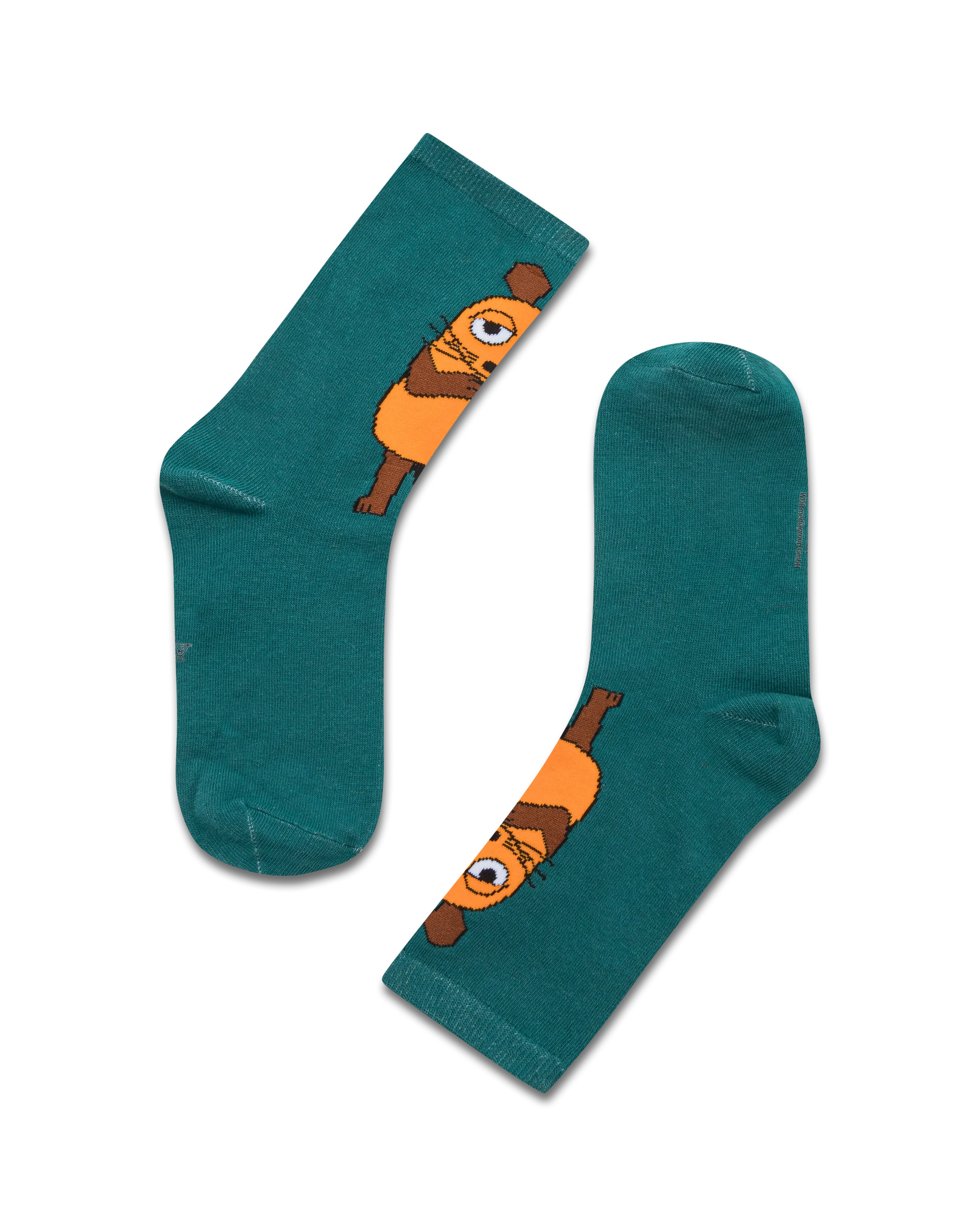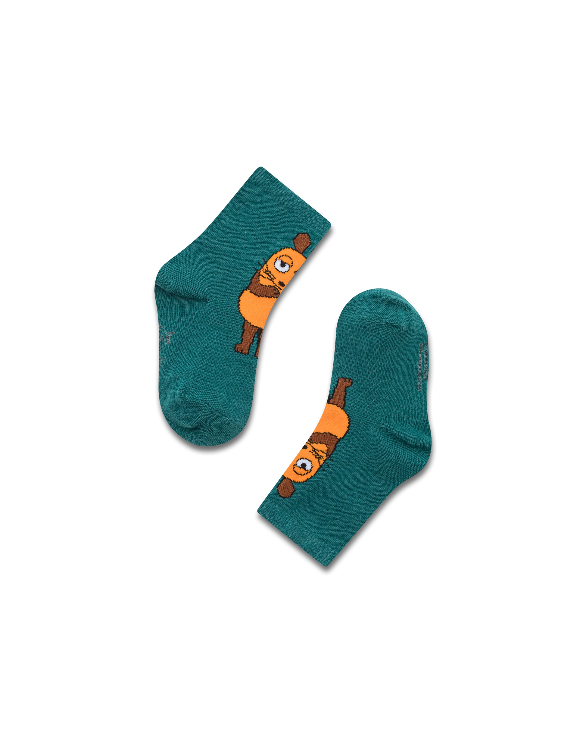 Die Maus "Zwinker" Socken in türkis mit der Maus in bekannter Pose vorne groß eingewebt.