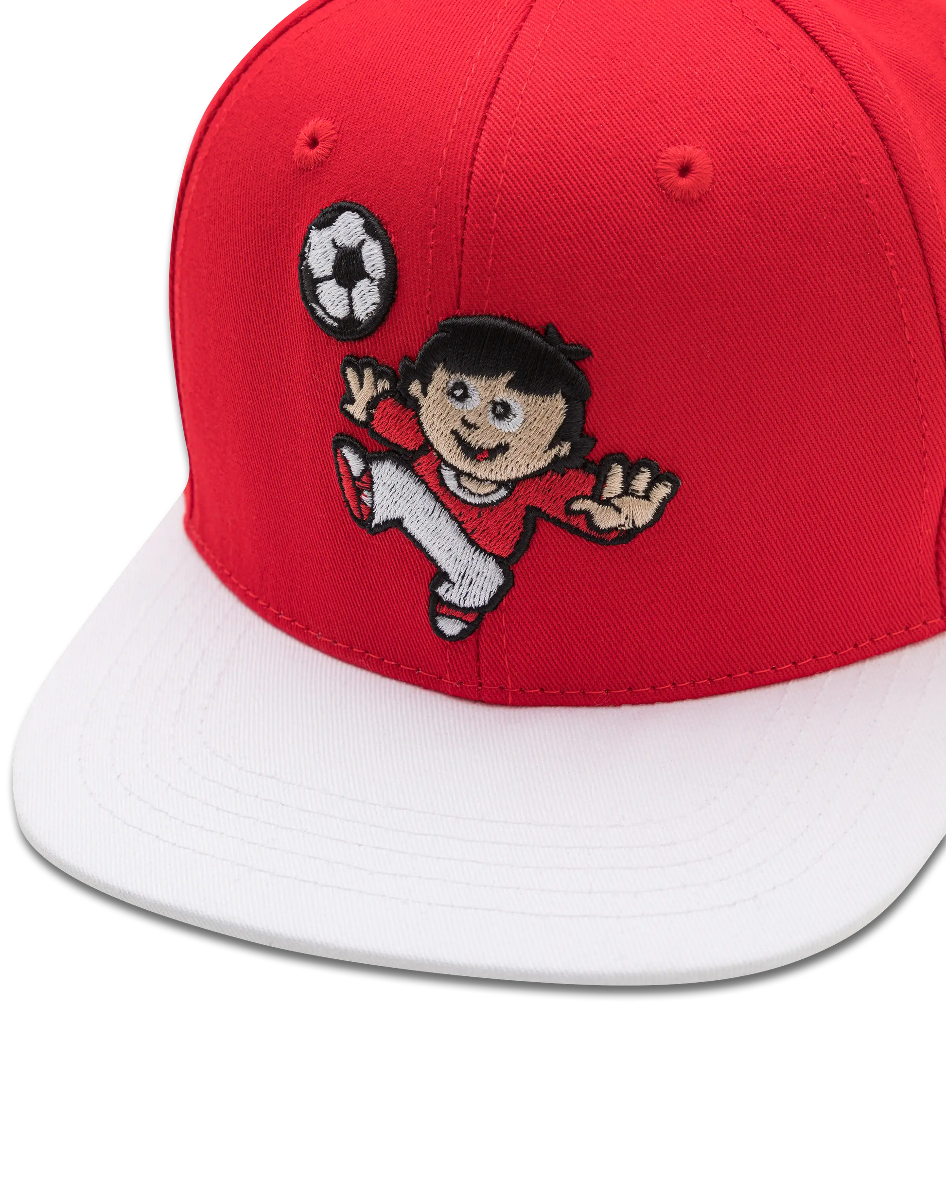 Die Mainzelmännchen "Fritzchen am Ball" Snapback in rot/weiß. Vorne ist Fritzchen beim Fußball spielen gestickt.
