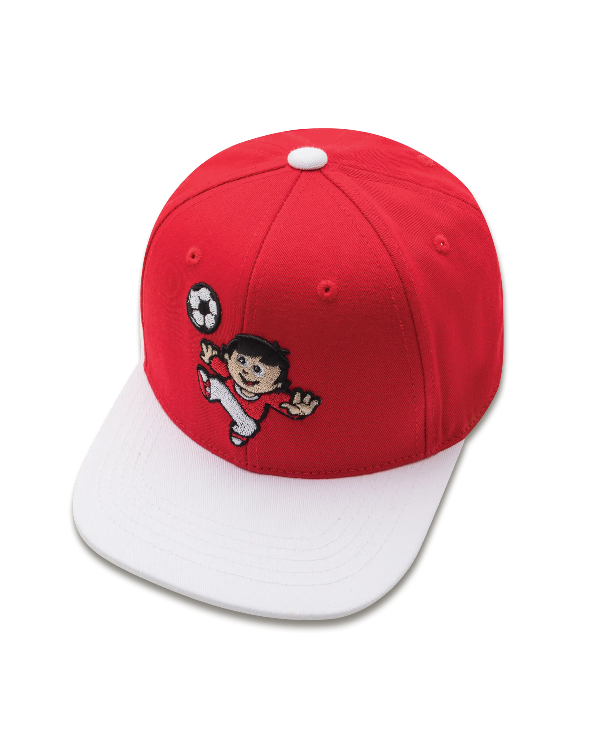 Mainzelmännchen Snapback in Rot/Weiß – mit Fritzchen beim Fußball, sportlich verspielt für kleine Fans der Kultfiguren.