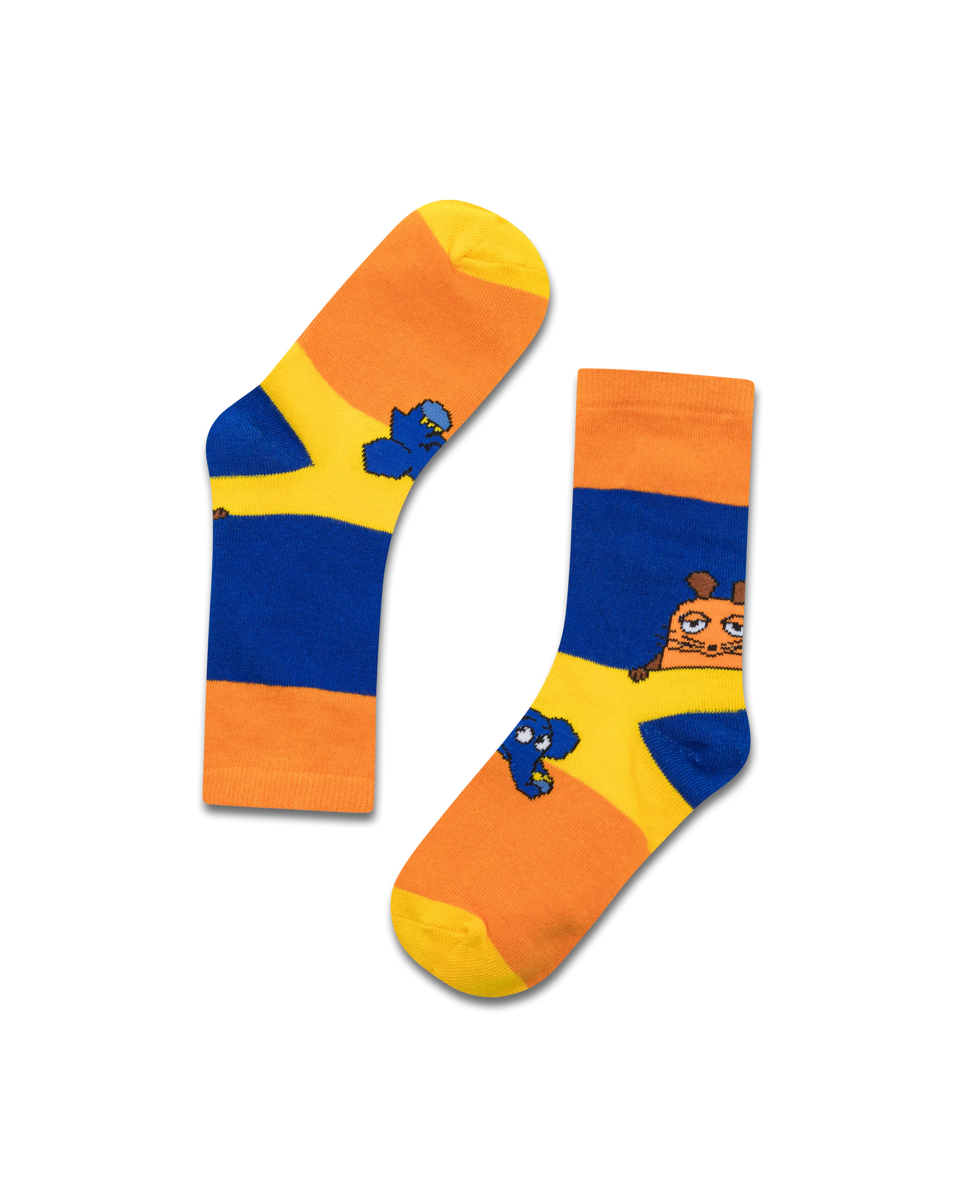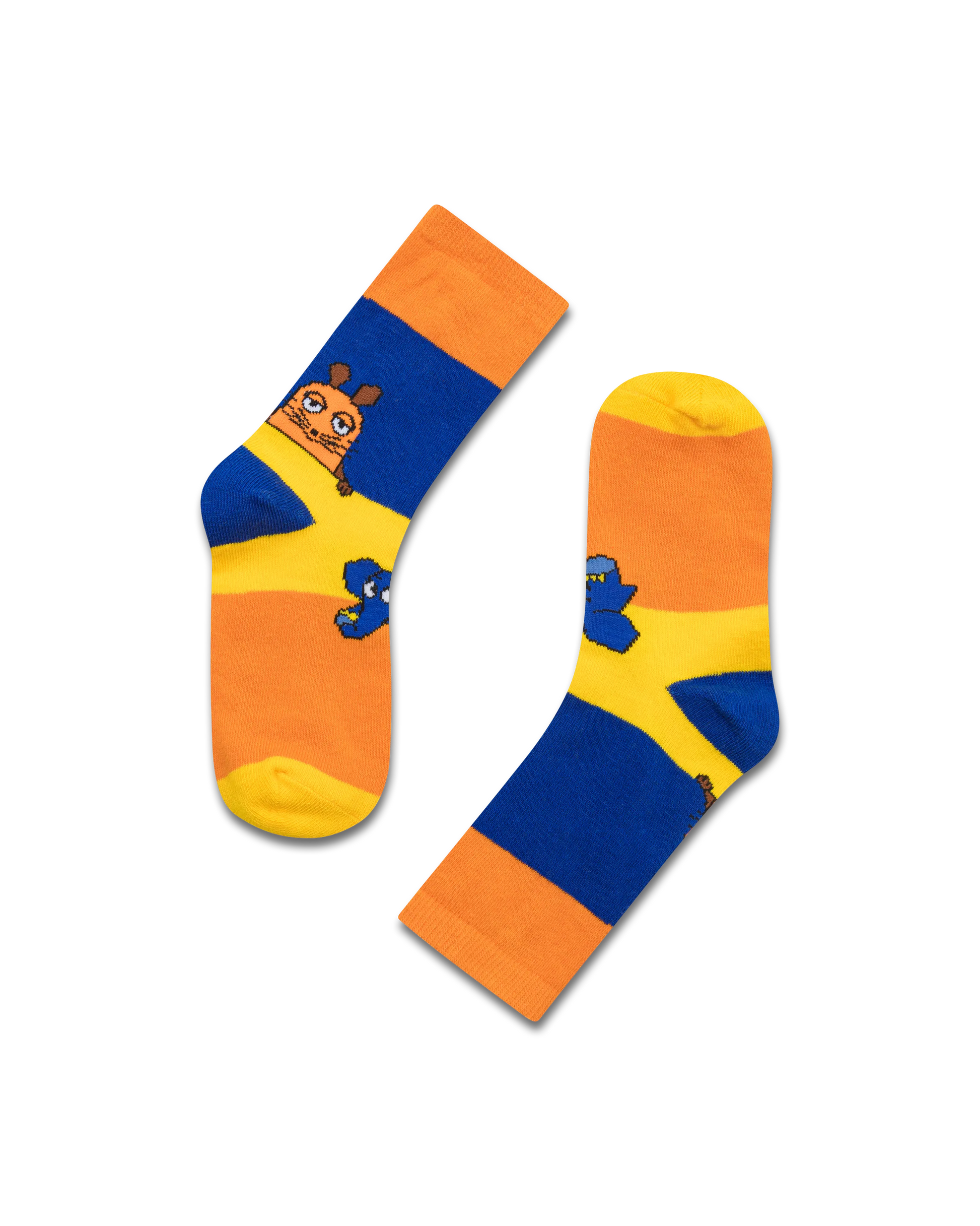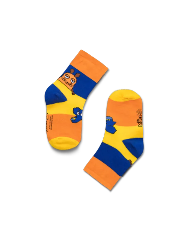 Die Maus & Elefant "Color Block" Socken mit blau, gelb, orangenen Streifen. Auf der linken Seite ist die Maus und auf der rechten Seite der Elefant eingewebt.