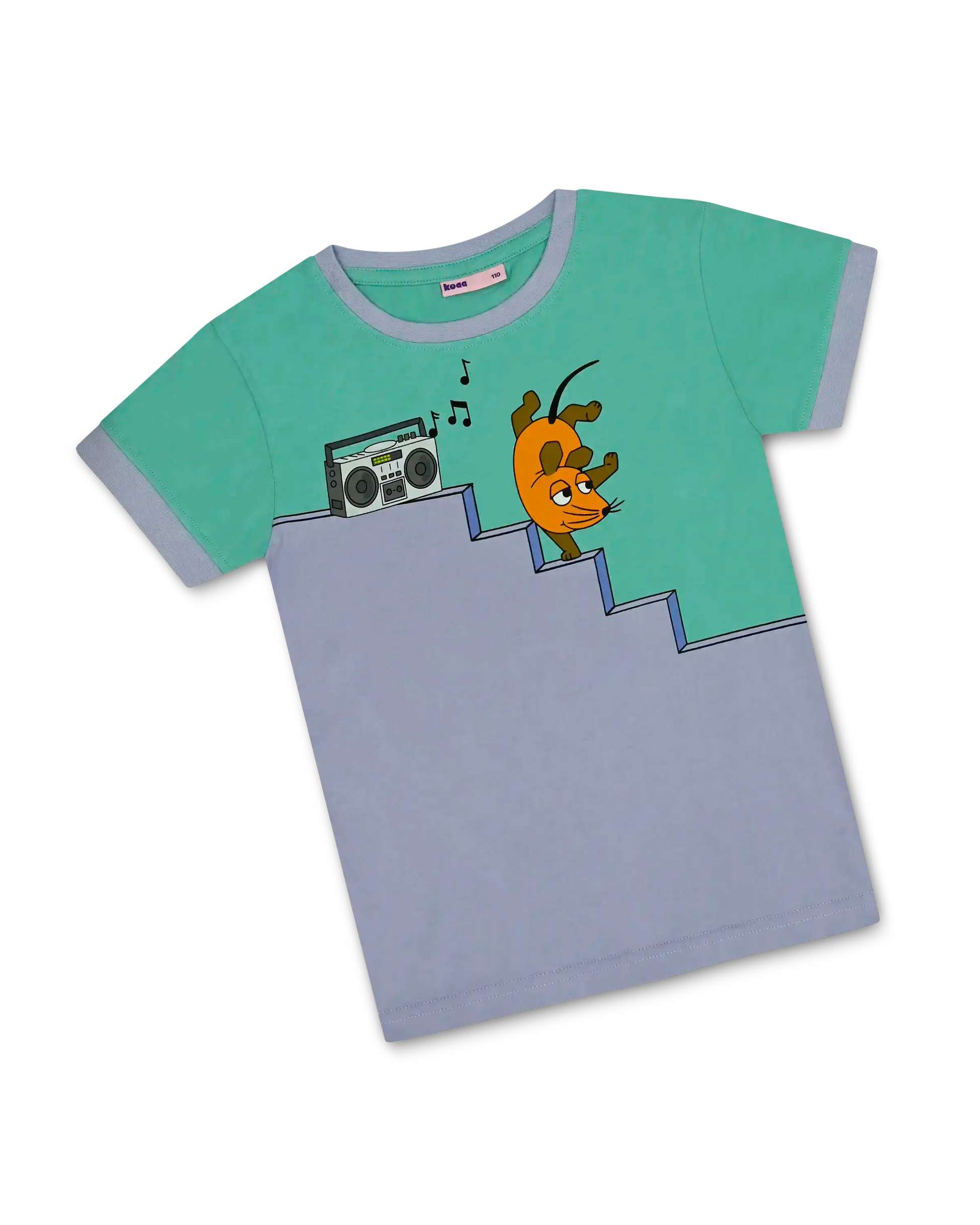 Das „koaa – Maus, Elefant & Ente „Boombox“ – T-Shirt“ in Grün und Lila bringt gute Laune und Schwung in jedes Kinderzimmer! Die Maus tanzt zur Musik aus der Boombox, während Elefant und Ente auf der Rückseite schon auf der nächsten Stufe warten. Mit dem coolen Treppenprint und den starken Farben ist dieses Shirt ein echtes Highlight für kleine Fans der „Sendung mit der Maus“. Aus weicher GOTS zertifizierter Baumwolle gefertigt – ideal zum Toben, Tanzen und Wohlfühlen.