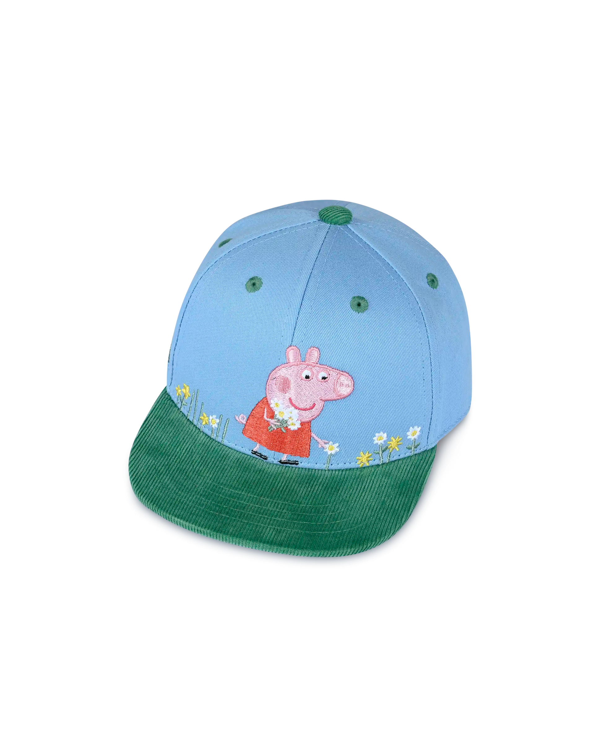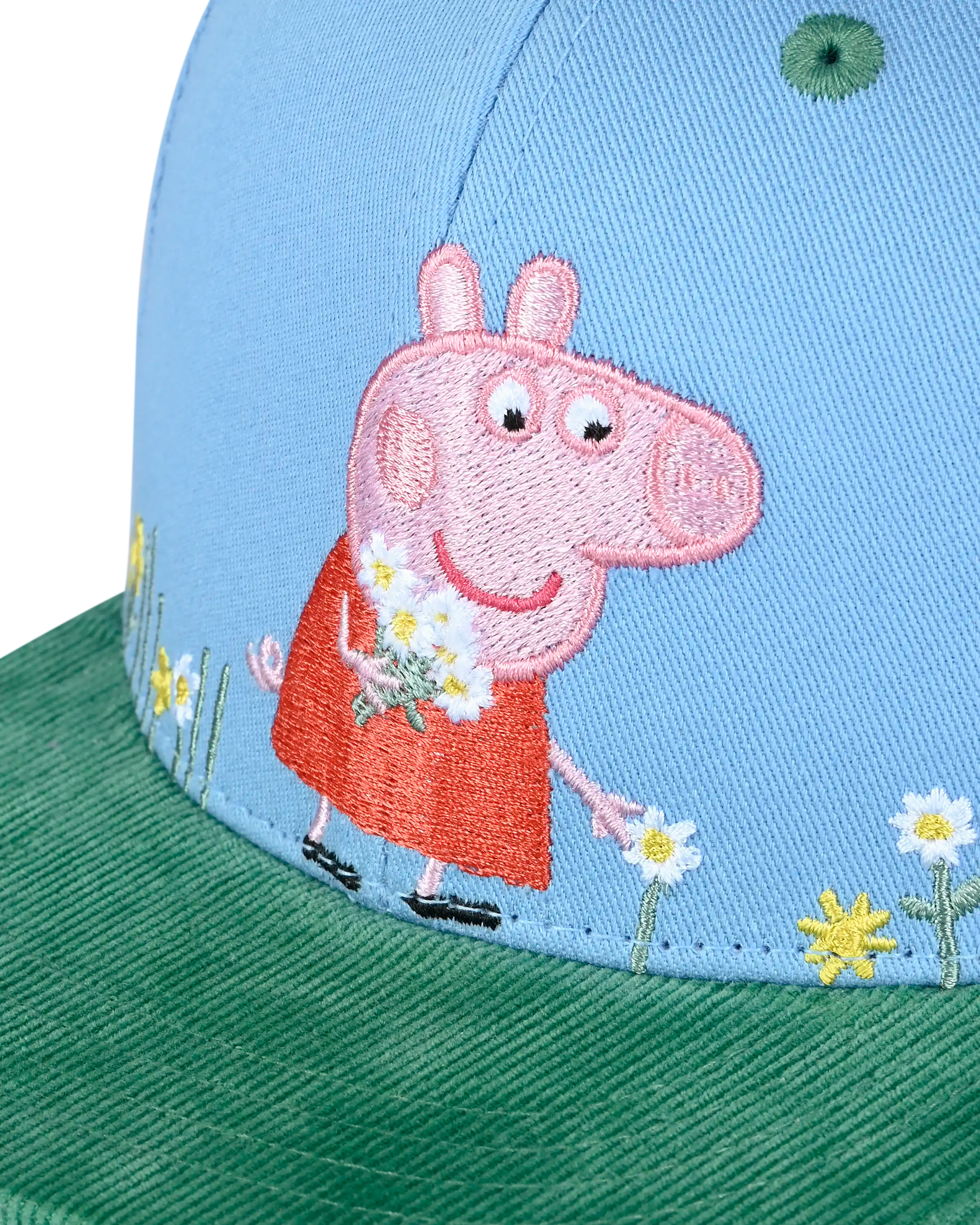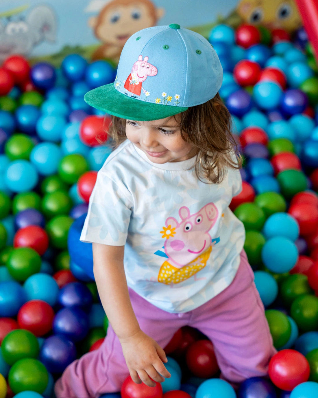 Die Peppa Wutz „Frühling“ Snapback in Blau und Grün bringt sonnige Stimmung auf den Kopf! Peppa steht auf der Vorderseite in einer Blumenwiese und genießt den Frühling – auf der Seite ist ihr gelbes Haus samt Sonne und Wolken zu sehen. Der perfekte Begleiter für kleine Frühlingsfans!