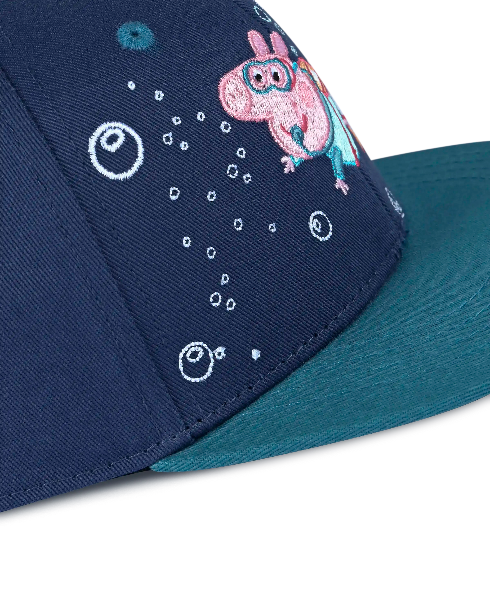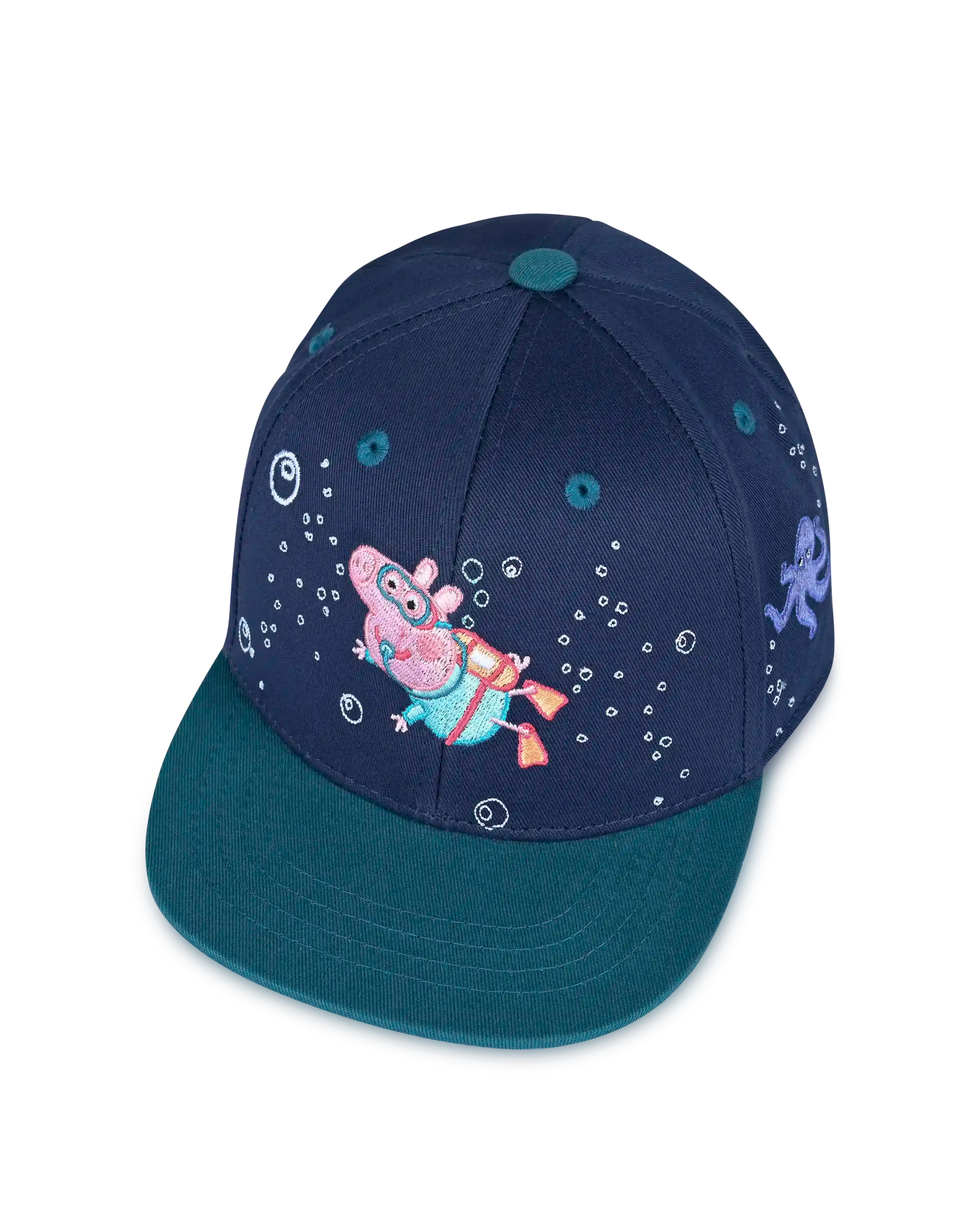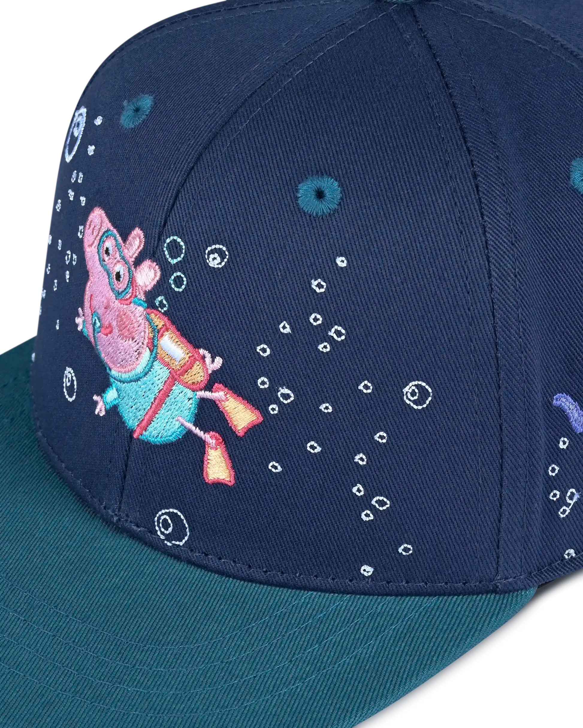 Die Peppa Wutz „Unter Wasser“ Snapback in Navyblau aus 100 % Baumwolle zeigt Peppa als kleine Taucherin auf Entdeckungstour. Blubberblasen und eine kleine Qualle auf der Rückseite machen das Design besonders verspielt – perfekt für sonnige Tage, Abenteuer im Garten oder einfach zum Coolsein auf dem Spielplatz.