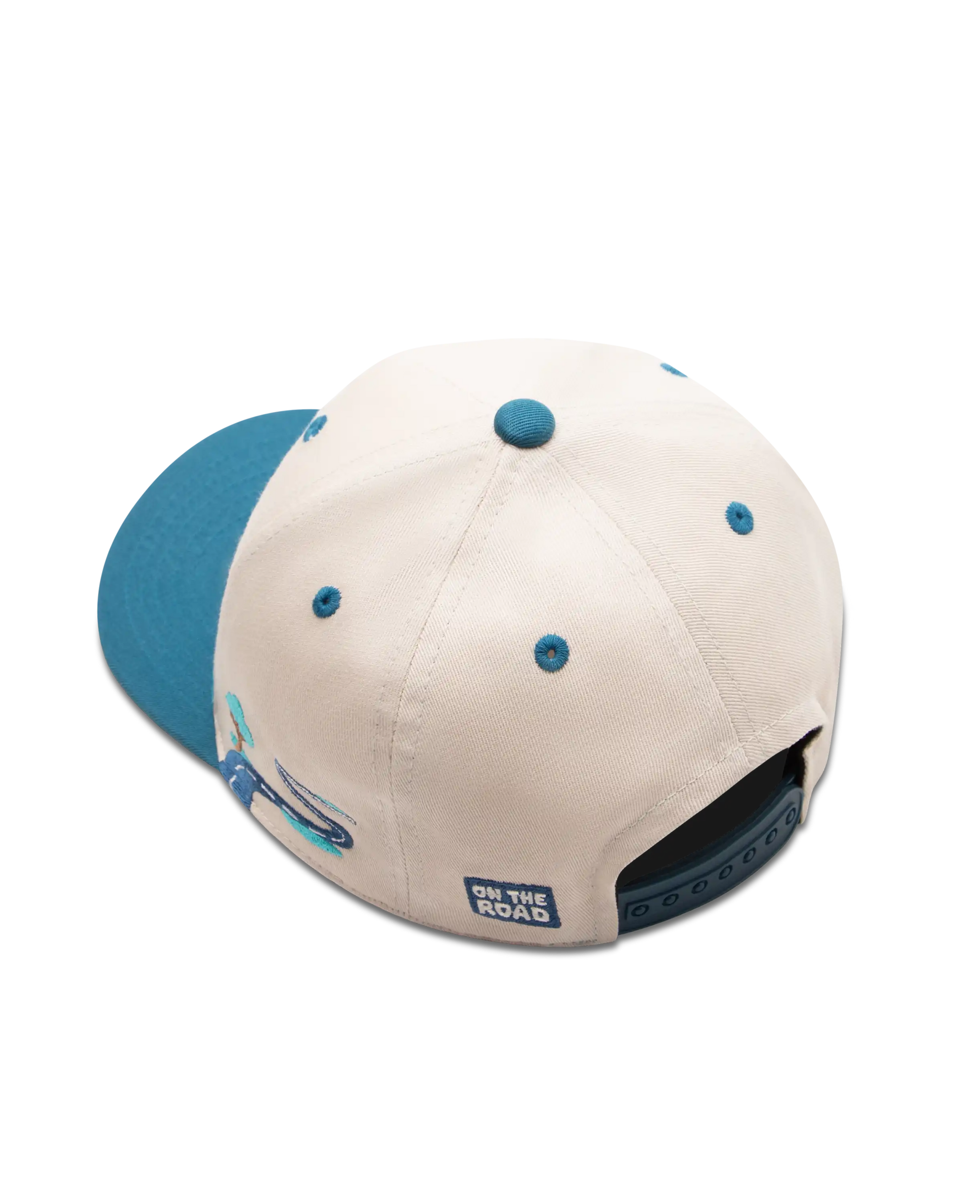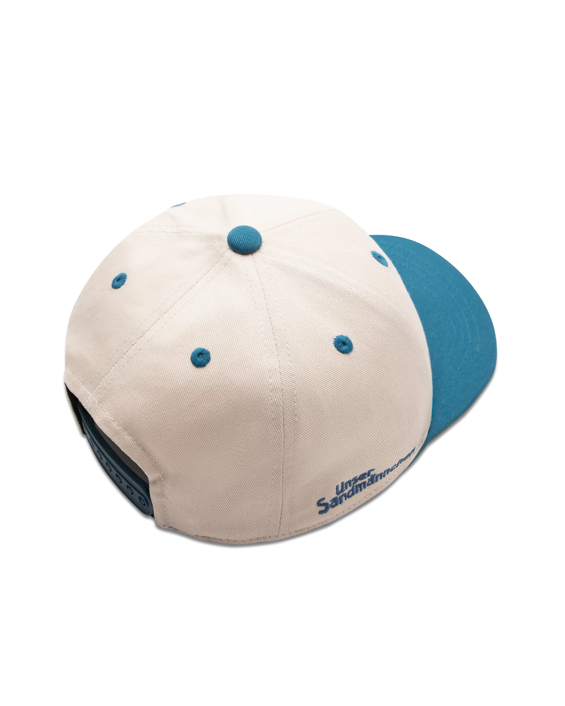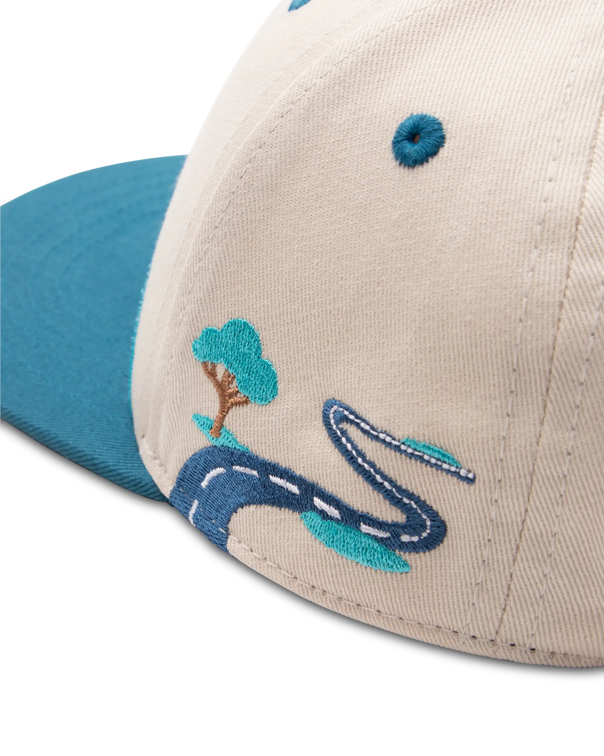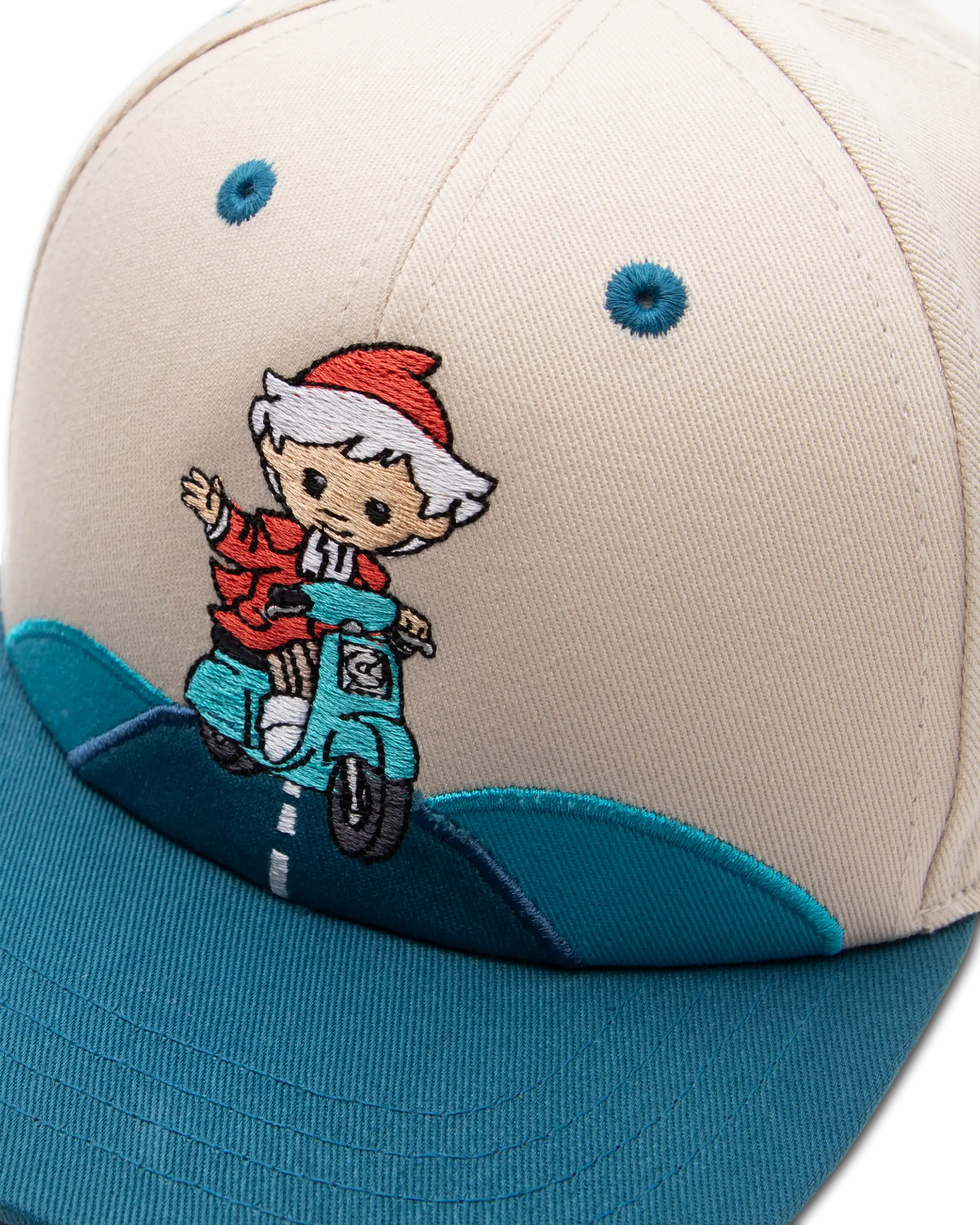 Diese abenteuerliche Sandmännchen Snapback für Kinder ist der ideale Entdecker-Begleiter! Im Zentrum steht das Sandmännchen auf dem Roller inmitten von Straßen und Landschaft, das zum Mitfahren einlädt. Das Design wird durch beige Basis mit petrolfarbenem Schirm und Stickereien ergänzt.