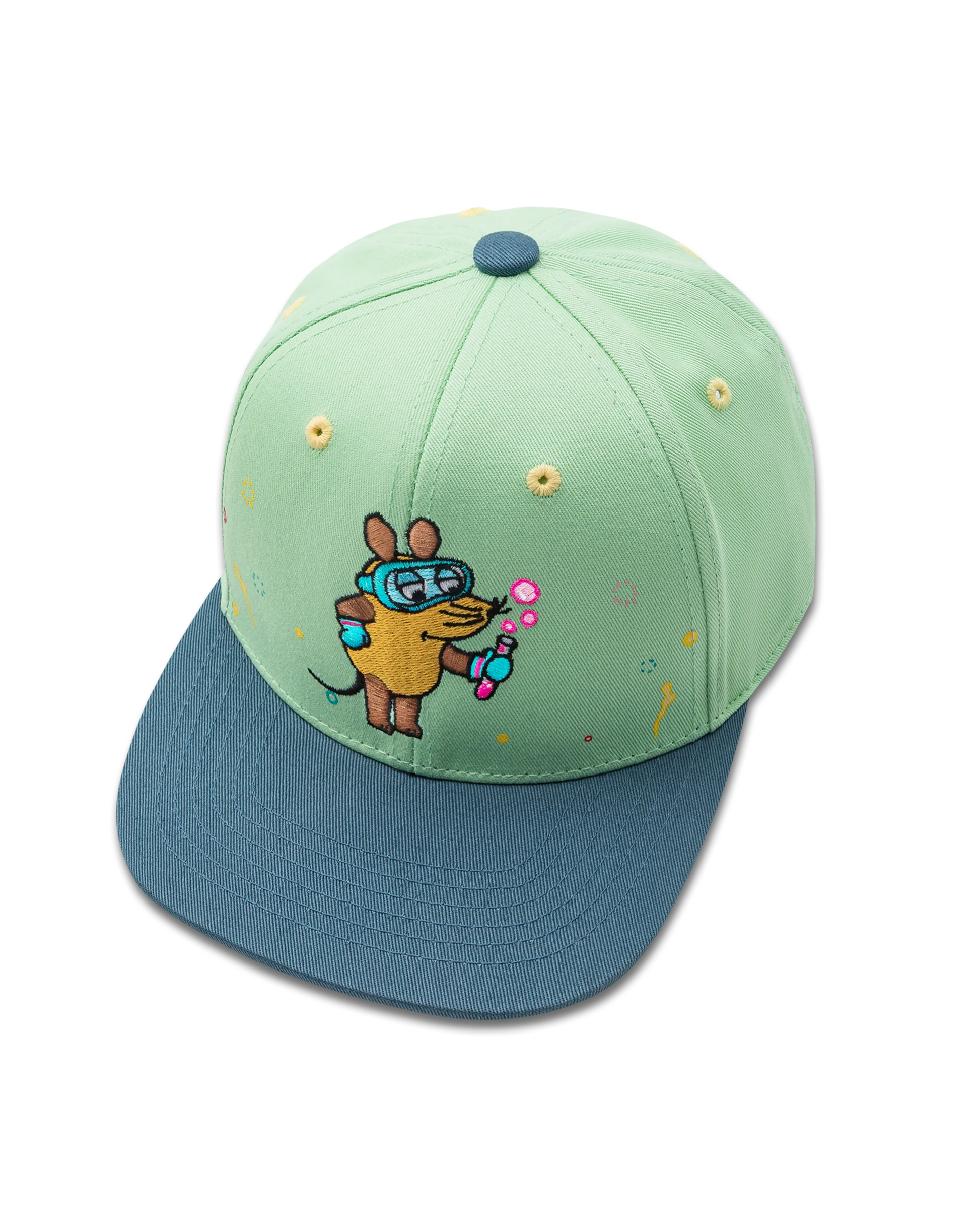 Hellgrüne Chemiker-Snapback mit Maus und bunten Blasen – kreativ, farbenfroh und perfekt für kleine Entdecker und Neugierige.