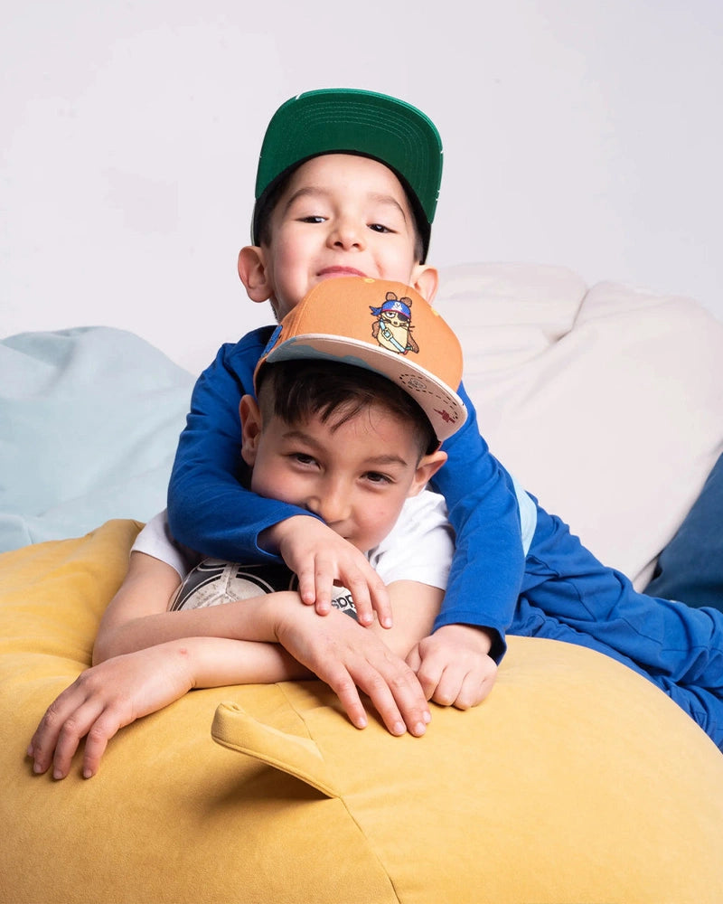 Piraten-Snapback in Braun/Beige mit Schatzkarten-Schirm – fein bestickte Maus vorn, ideal für kleine Abenteurer auf Schatzsuche.
