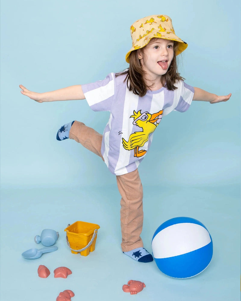 Das Ente Ice Cream Stripes T-Shirt in Weiß und Lila bringt sommerliche Frische ins Outfit – mit verspieltem Streifenmuster und der Ente, die fröhlich ihr Eis genießt. Perfekt ergänzt wird es durch den Maus Ice Cream Bucket Hat, der mit seiner bunten Illustration von Maus und Eiscreme für gute Laune und zugleich Sonnenschutz sorgt. Zusammen entsteht ein Set, das nach Sommer, Spaß und süßen Momenten schmeckt – leicht, farbenfroh und ideal für heiße Tage voller Abenteuer.