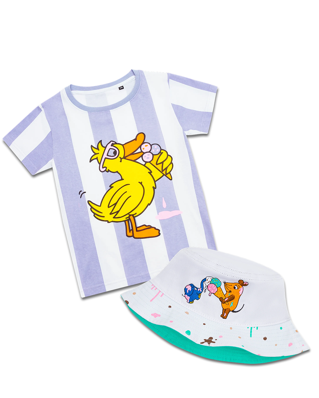 Sommer, Sonne, Eis – Ente Ice Cream T-Shirt & Maus Bucket Hat im fröhlichen Set.