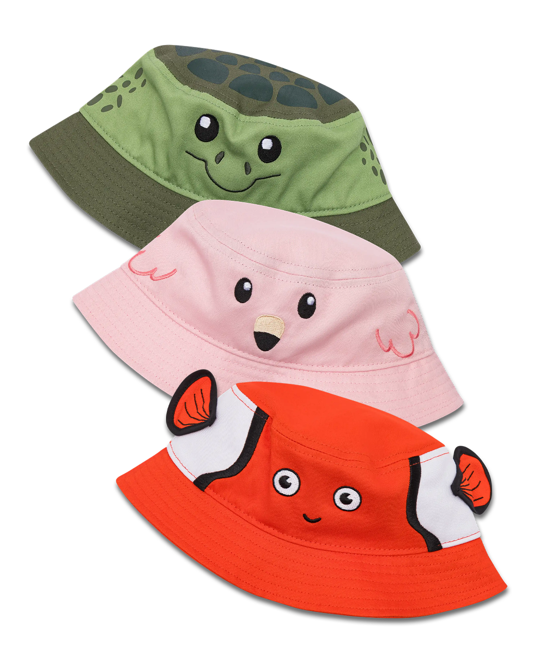 Das Fischerhut Trio bringt tierisch gute Sommerlaune in jedes Outfit: Der pinke Franz der Flamingo Fischerhut sorgt für tropisches Strandfeeling, der orangefarbene Clara der Clownfisch Fischerhut erinnert an bunte Unterwasserwelten, und der grüne Schorsch die Schildkröte Fischerhut steht für Abenteuer an Land und im Wasser. Hergestellt aus leichten Materialien bieten alle drei Hüte angenehmen Tragekomfort und zuverlässigen Sonnenschutz – perfekt für Spielplatz, Urlaub oder warme Tage am Meer.
